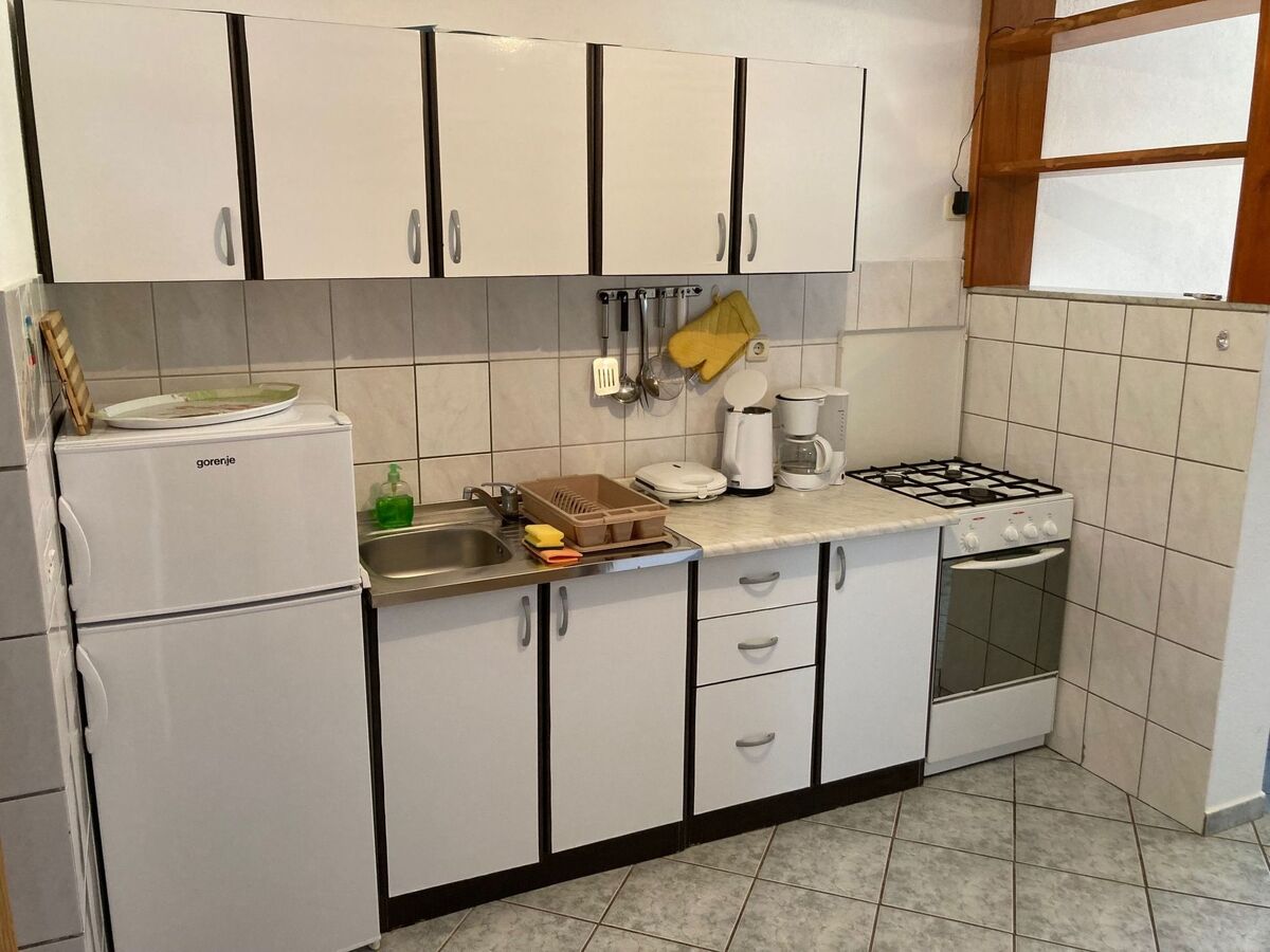 -Kitchen with cooking facilities, fridge, freezer, dining table, etc.