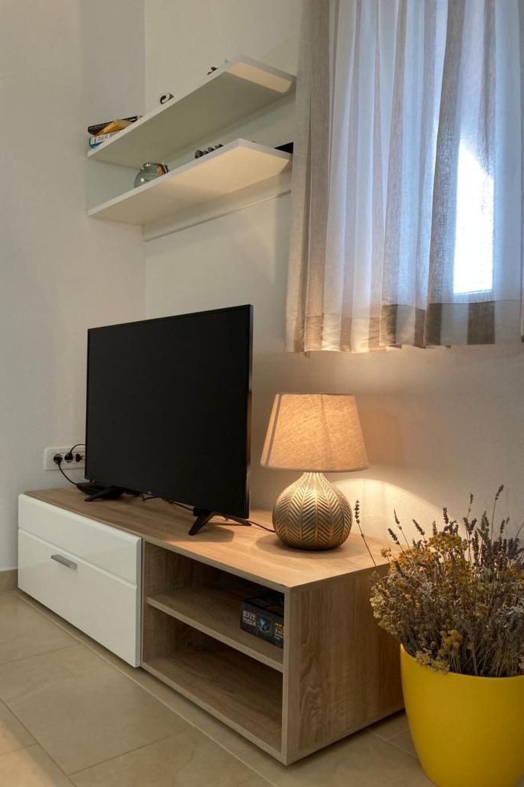 The sitting corner next to the dining table has a sofa bed for one person and a flatscreen TV.