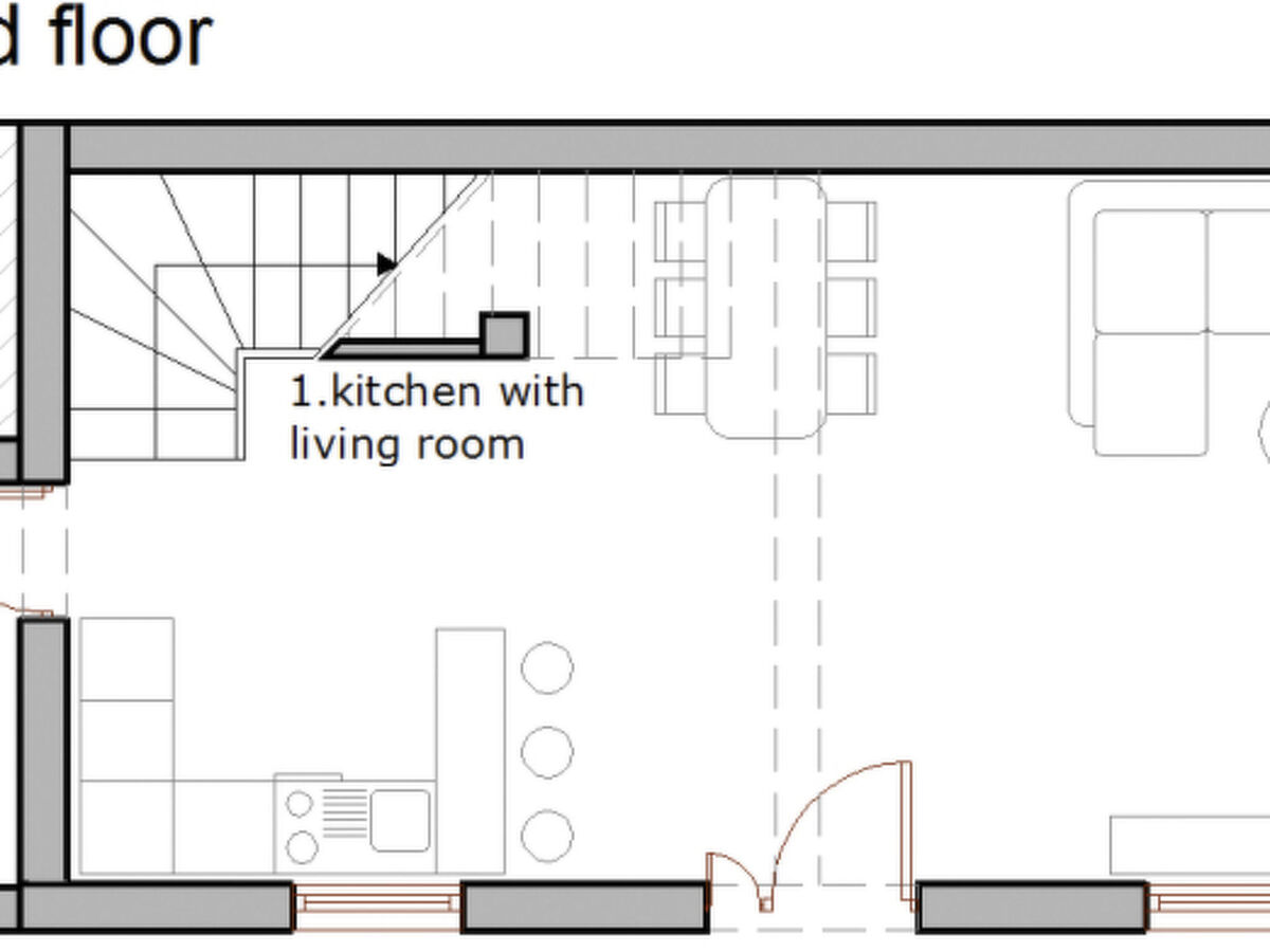 The ground floor measures 43m² and consists of a modern shower room and a living room with an integrated kitchen.