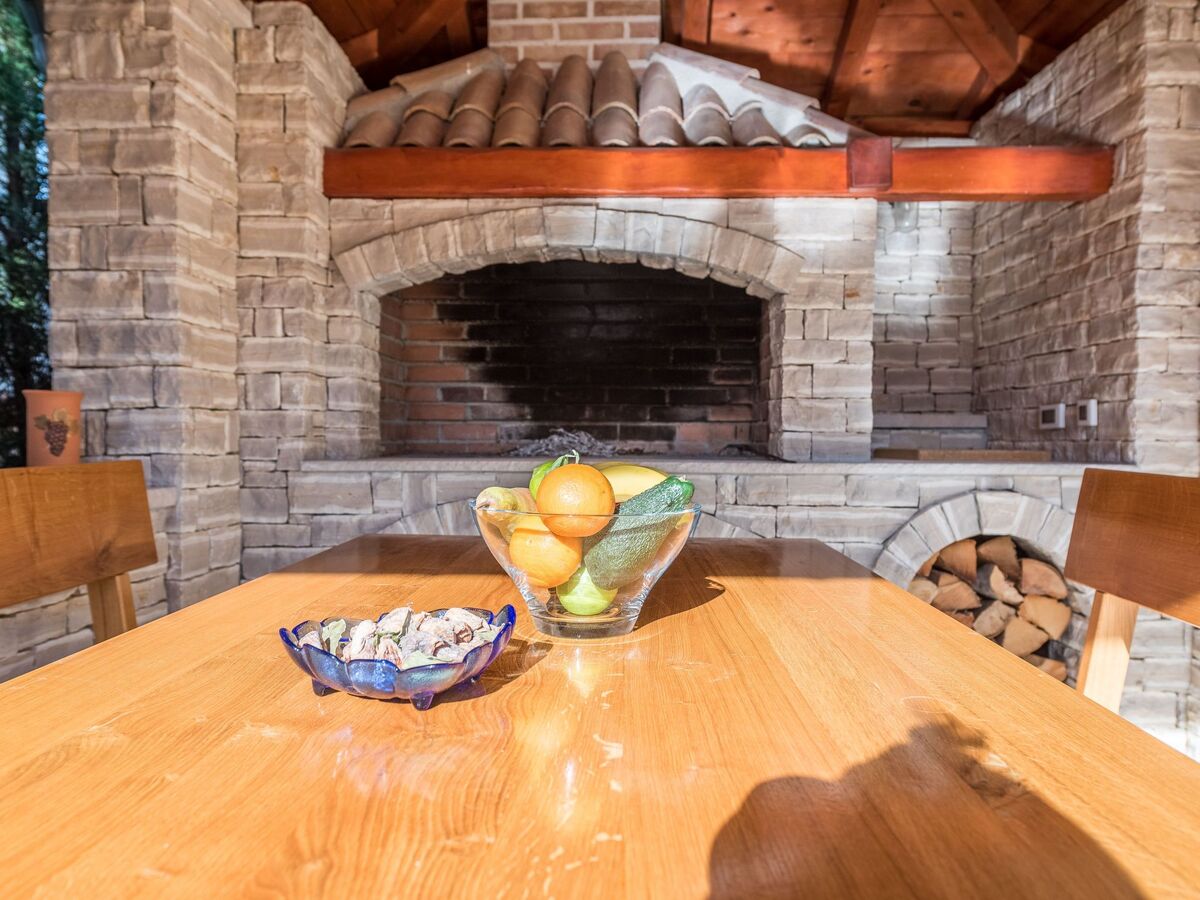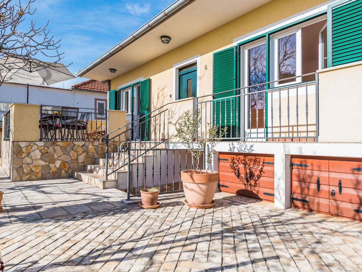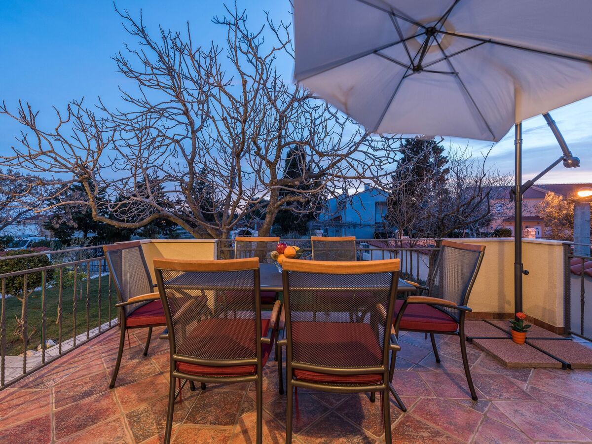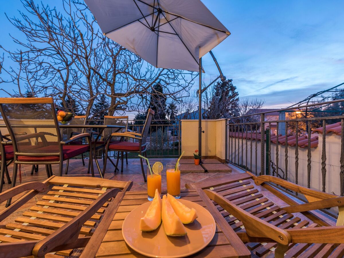 The terrace is equipped with garden furniture, a sunshade and two garden loungers.