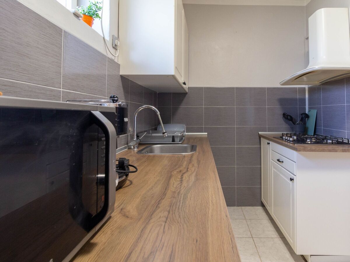 The kitchen is fully equipped with cooking and dining utensils, an oven, a coffee maker, and other standard kitchen appliances.
