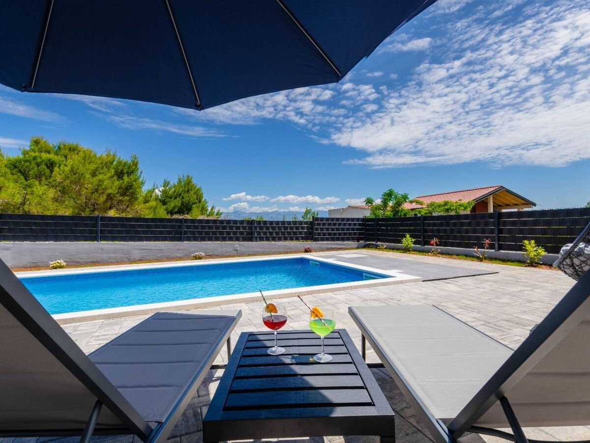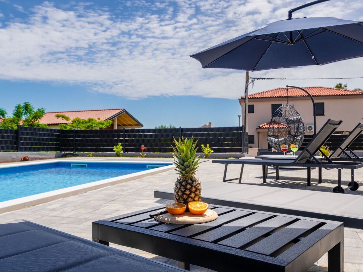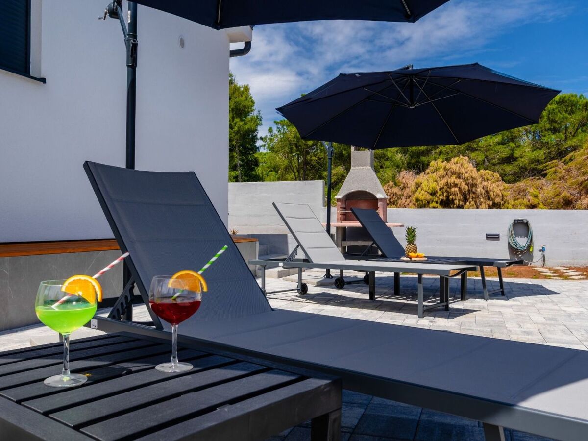 The outdoor area of the house offers a private swimming pool, sun loungers, a covered terrace for enjoying the shade, and an outdoor grill (komin) for preparing meals in the open air.