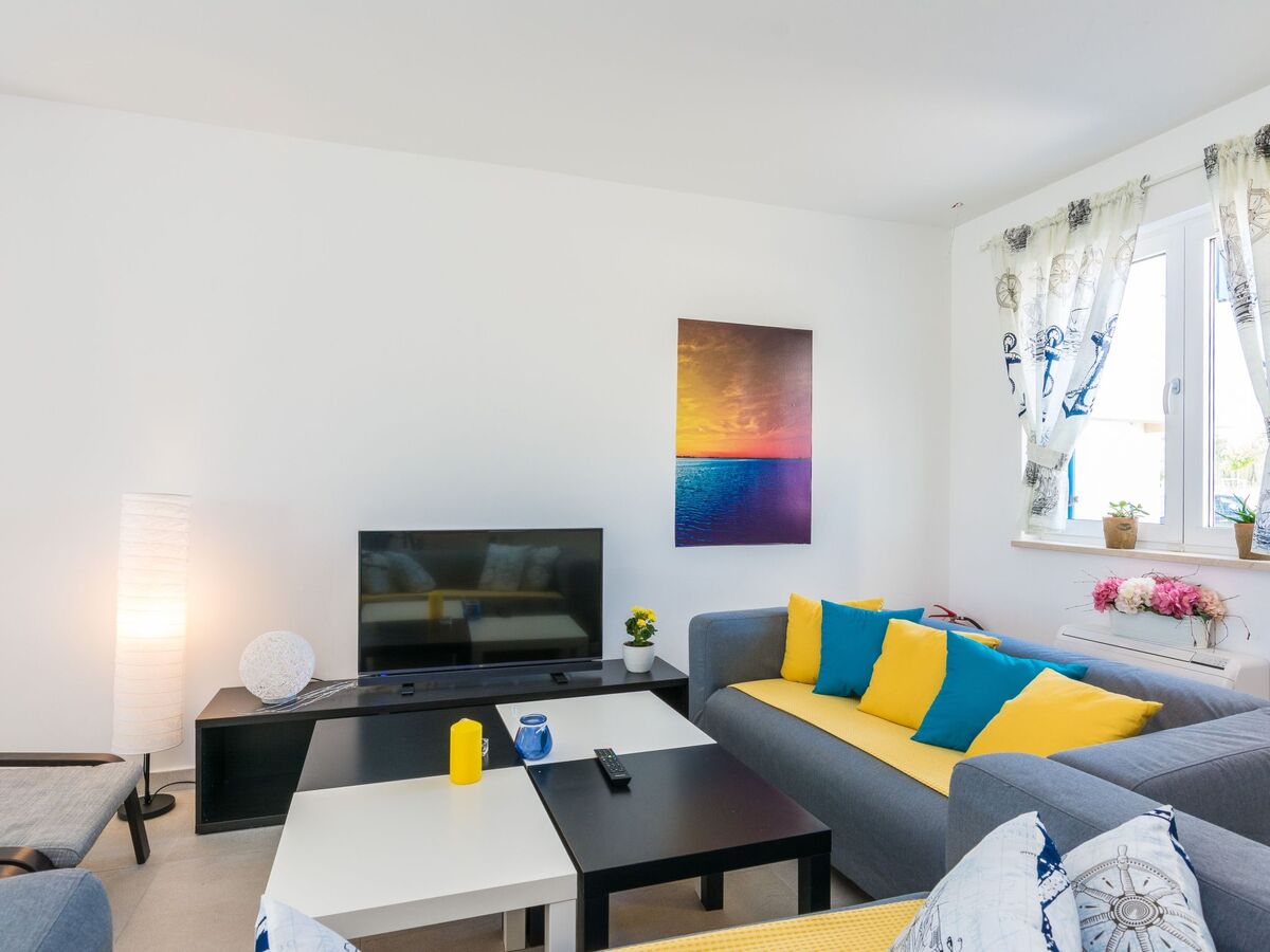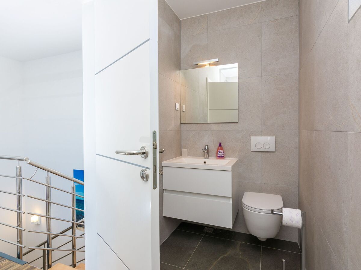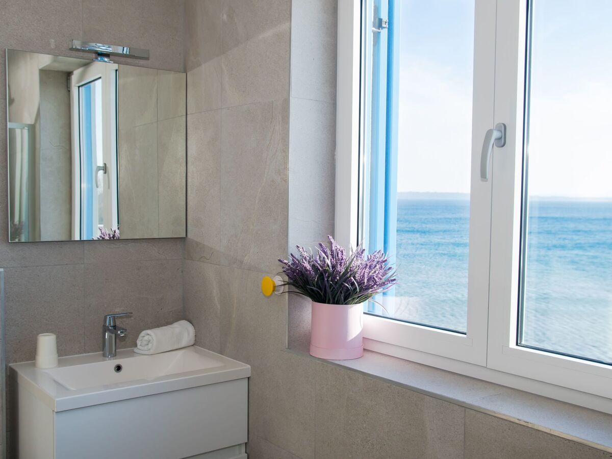 On the ground floor is the living room with a TV, dining area with large glass windows, the fully equipped kitchen with sea views and a bathroom.