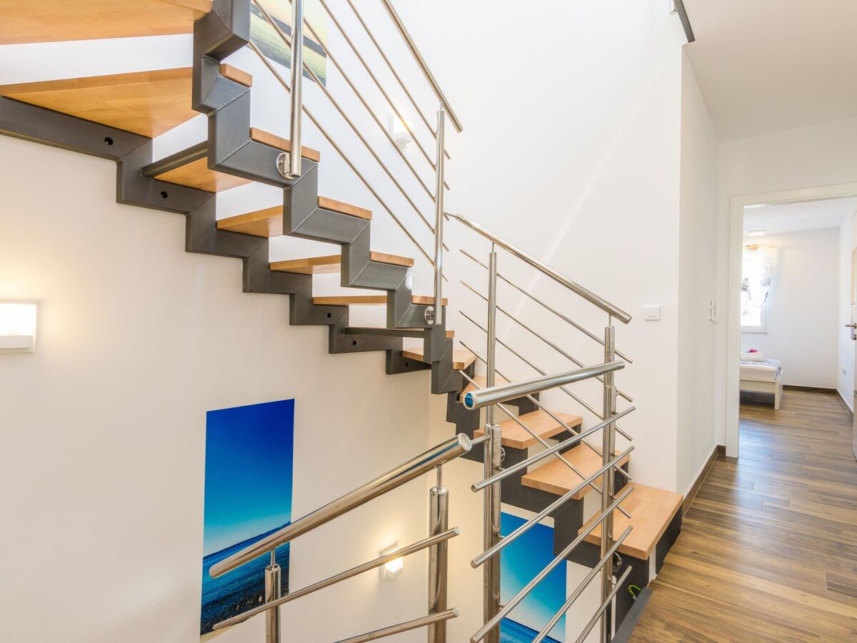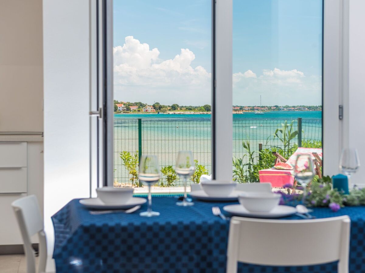 On the ground floor is the living room with a TV, dining area with large glass windows, the fully equipped kitchen with sea views and a bathroom.