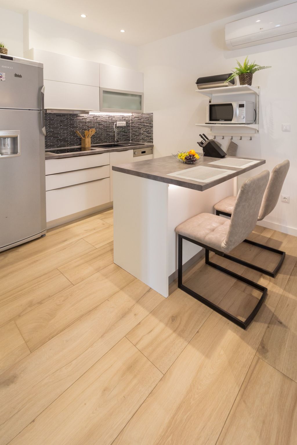 The ground floor also consists of a modernly designed kitchen, accompanied by a dining area and a comfortable living room.