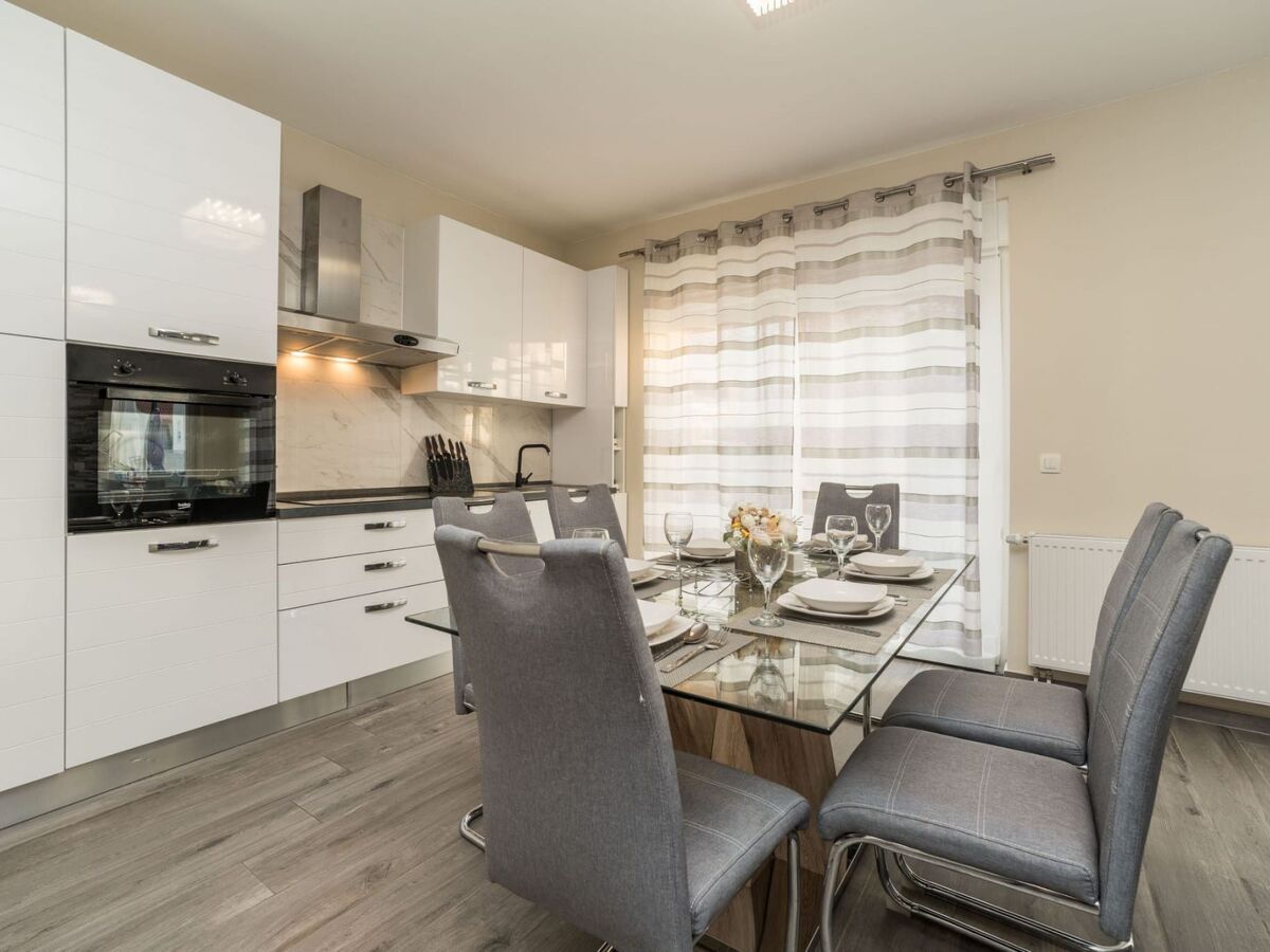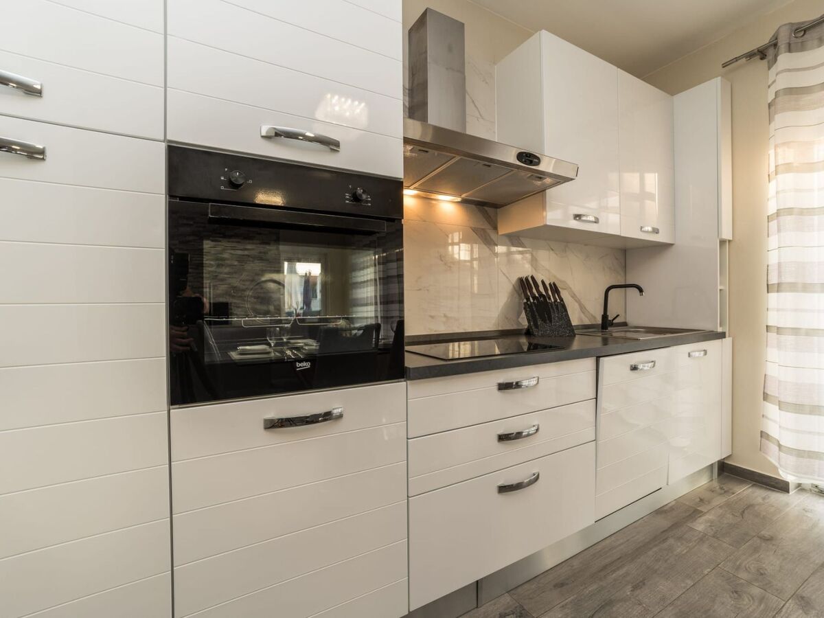 An equipped kitchen awaits guests on the ground floor with modern kitchen appliances, an open dining room, and a spacious bright living room with natural light, from which you exit to a beautiful, large yard with a private pool.