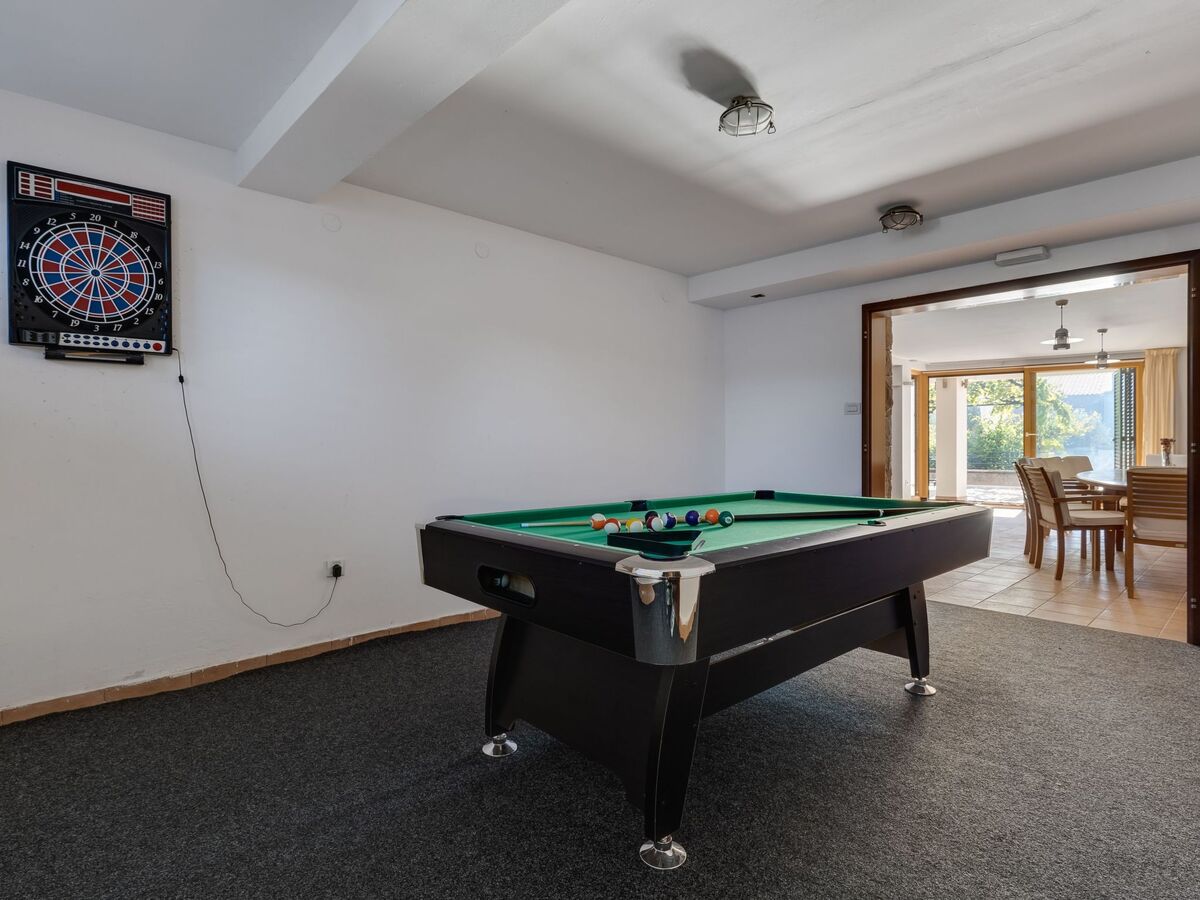 In the basement, you will find a cozy lounge area with a traditional fireplace, a large dining table, a small kitchen, and a gaming room with a pool table and table tennis – perfect for socializing and entertainment.