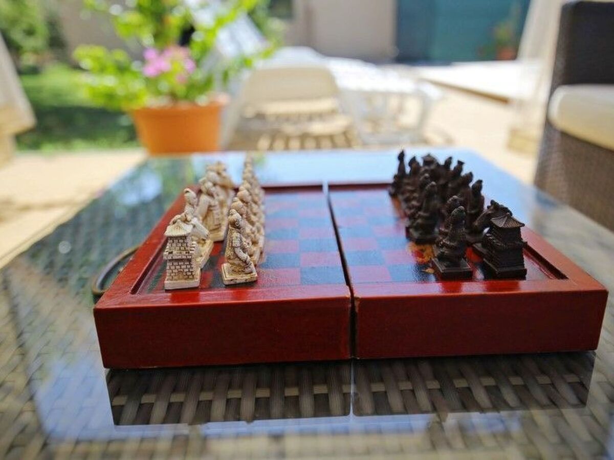 The terrace is equipped with garden furniture, a sunshade and four garden loungers.