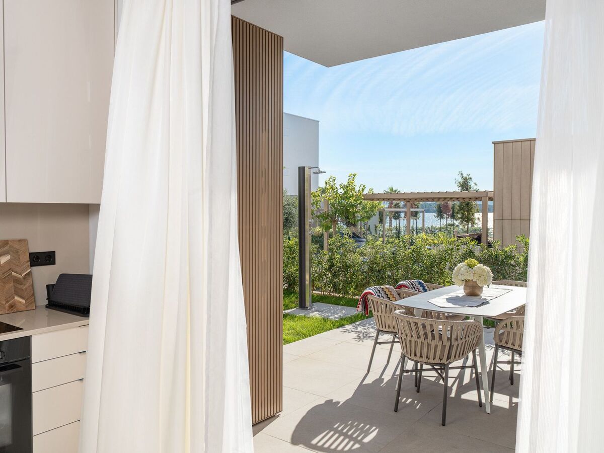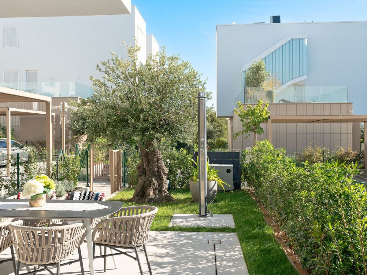 Part of the outdoor terrace is surrounded by a beautiful garden adorned with Mediterranean plants and an olive tree over 60 years old.