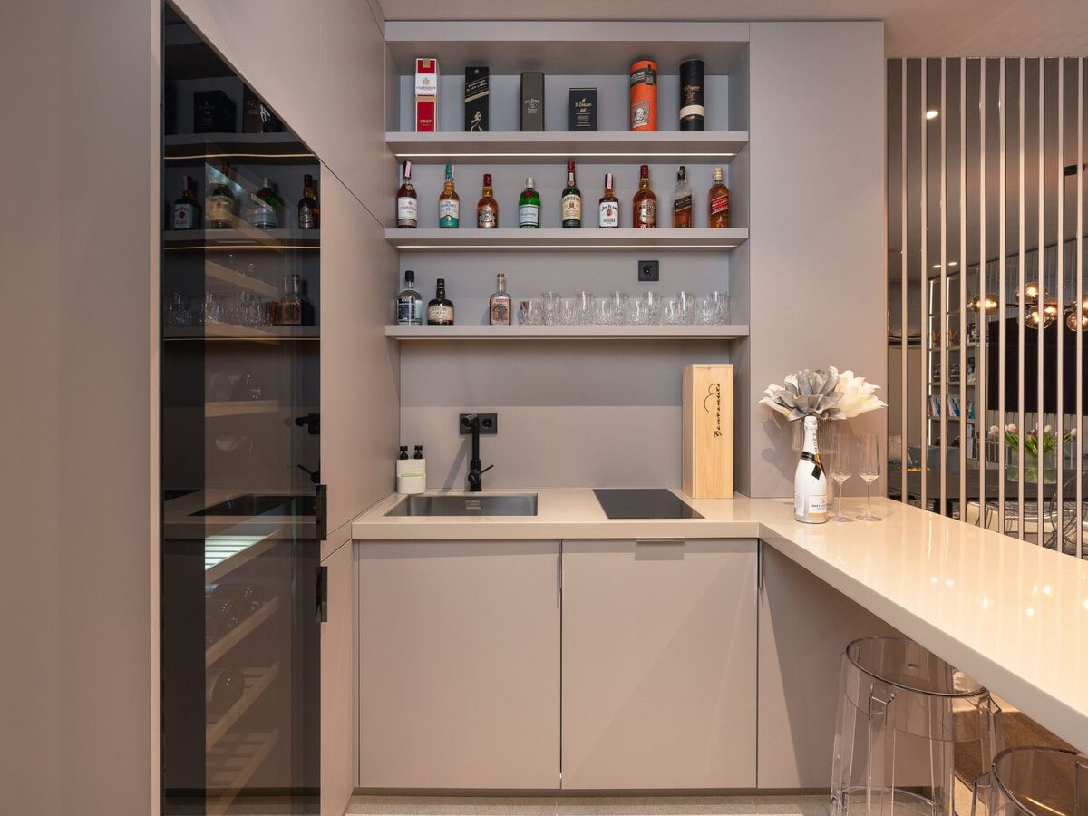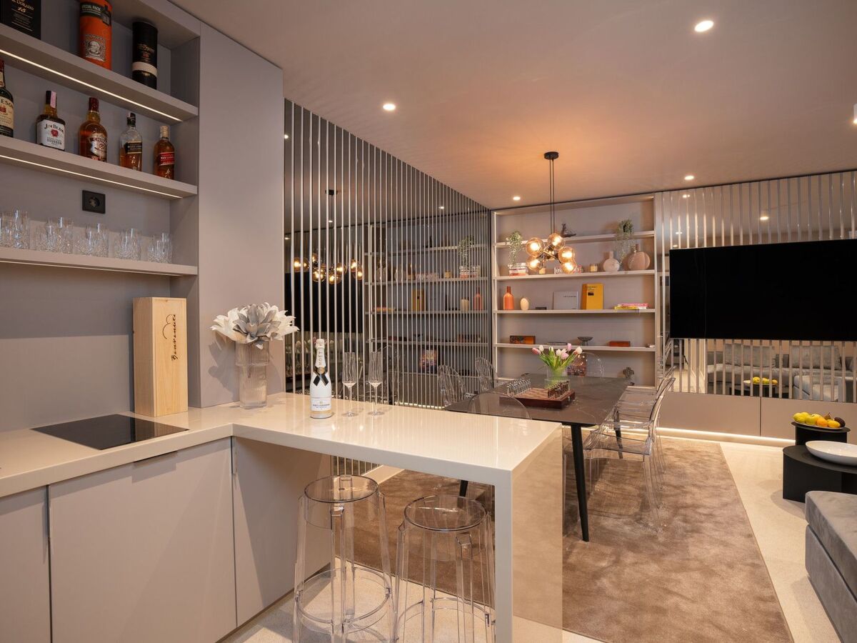 On the -1 floor, there is a relaxation room with a wine fridge, a kitchen with a bar, and a bar for all wine lovers.