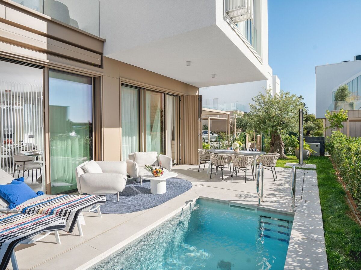 The ground floor consists of an entrance, a toilet, a living room with a kitchen and a dining room, and an exit to the terrace with a heated pool, next to which there are sun loungers for relaxation, lounge chairs, and a dining table.