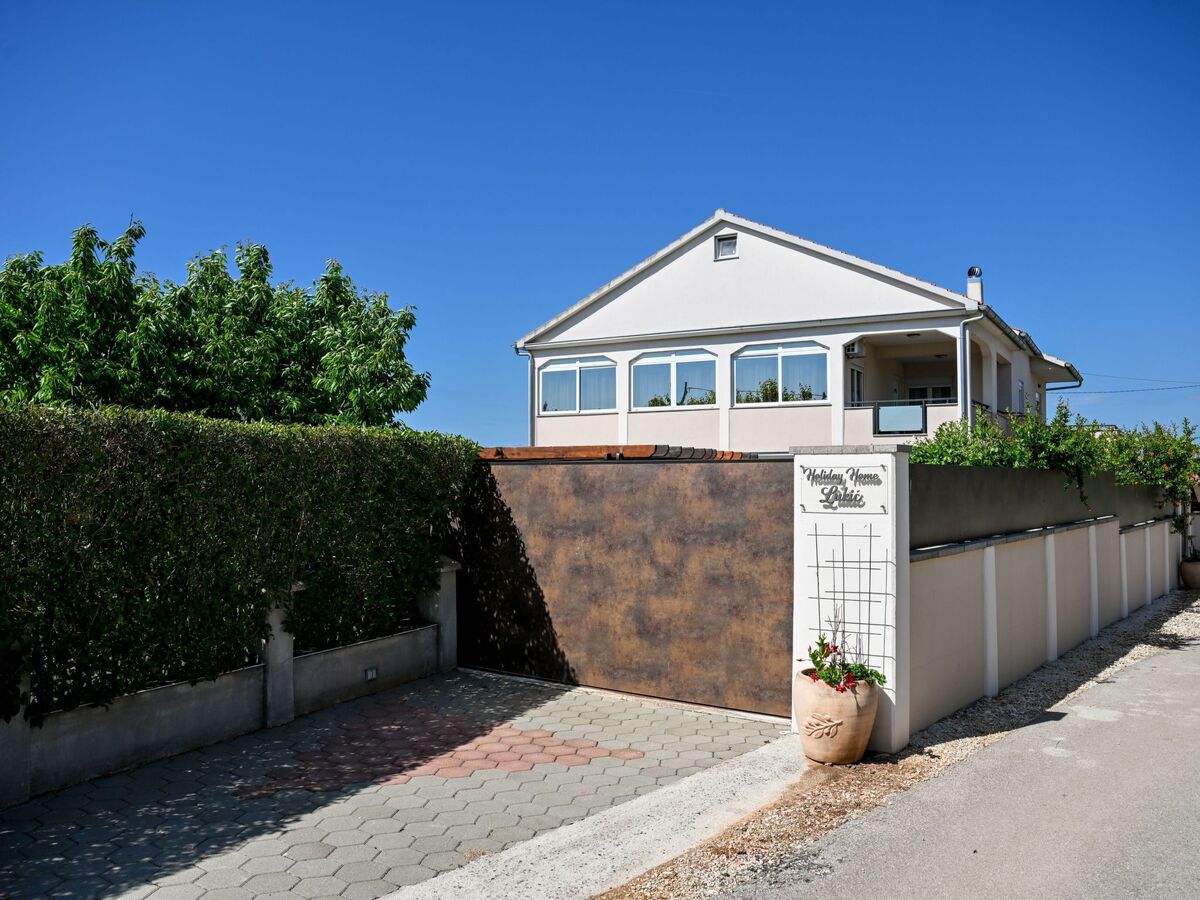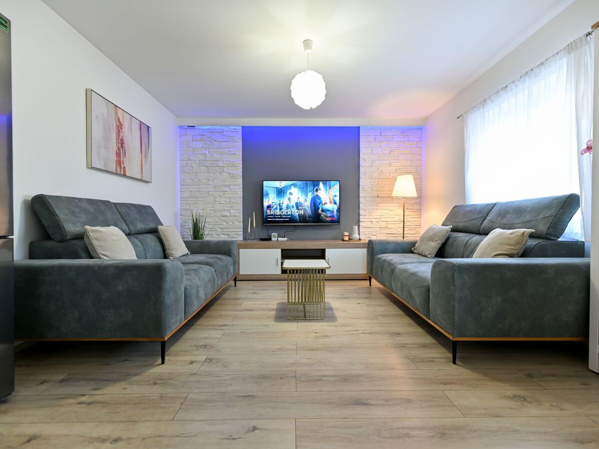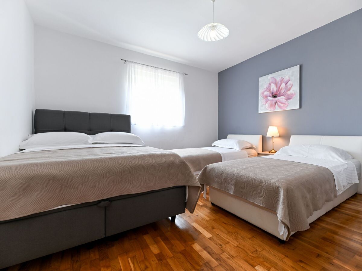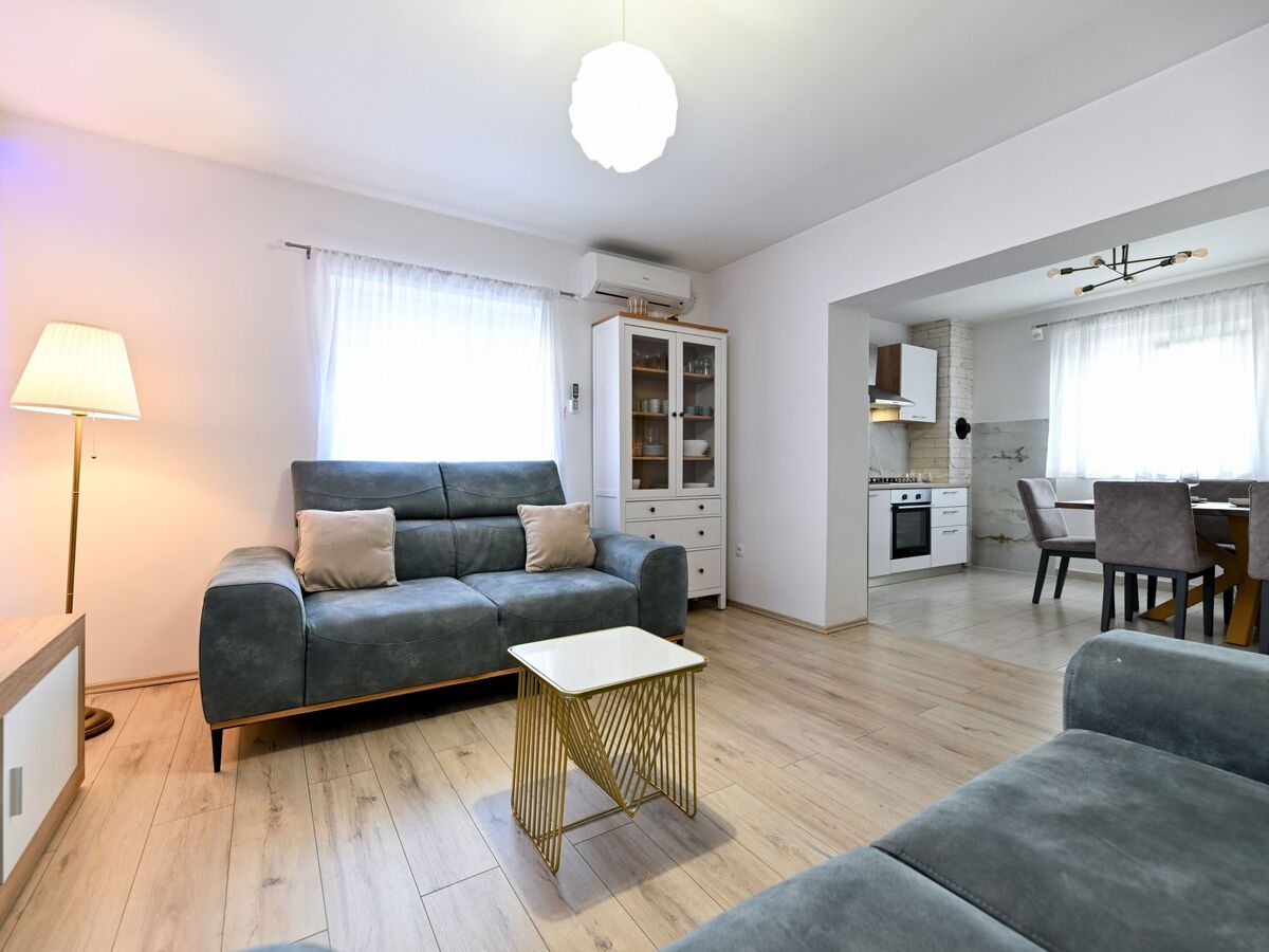 It can accommodate up to fourteen guests (the bedrooms are furnished with either a double bed or two single beds, and there is a double sofa bed in the living area).