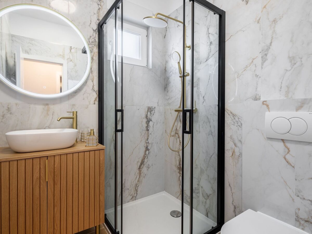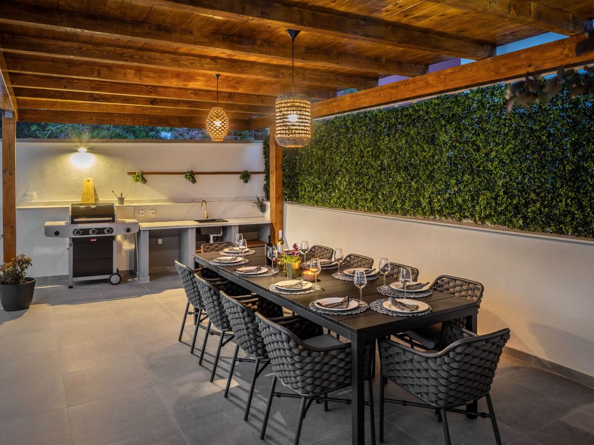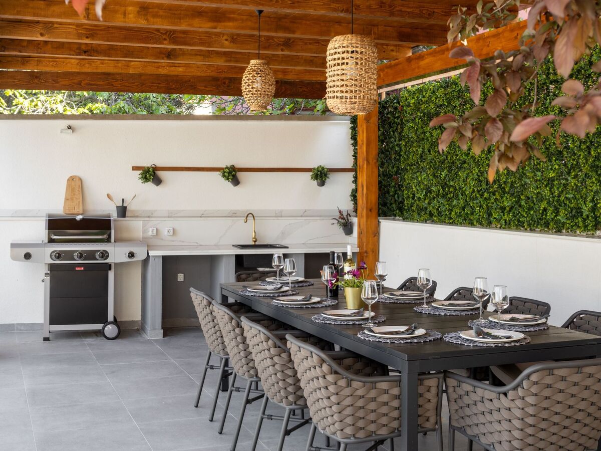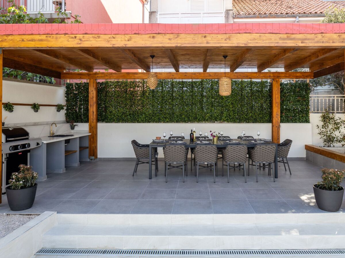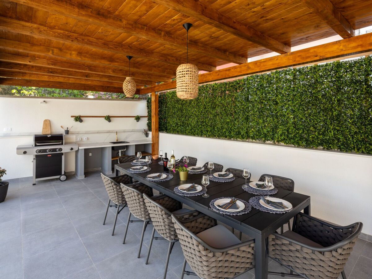 The garden is private and it has a terrace with a sunshade underneath which there is an outdoor kitchen and a dinning area for 10 persons.