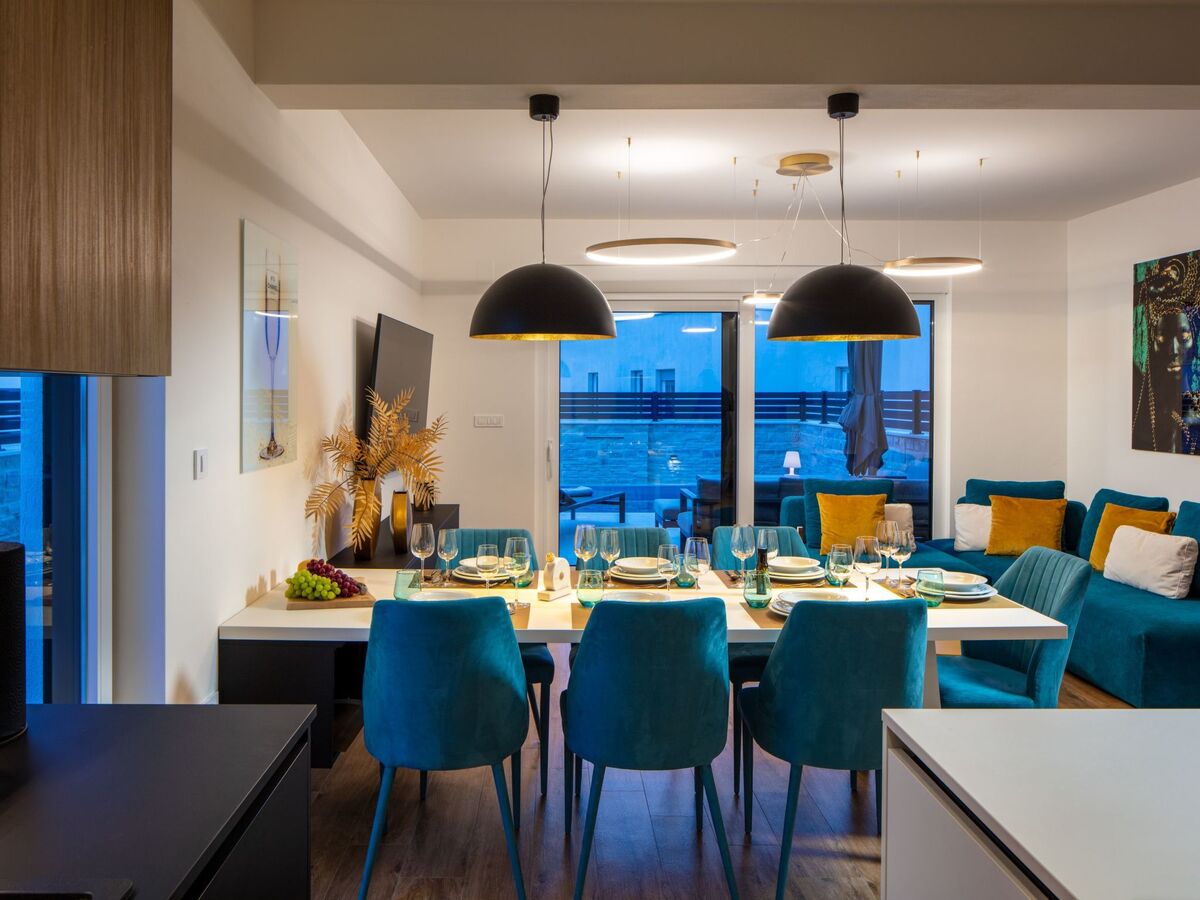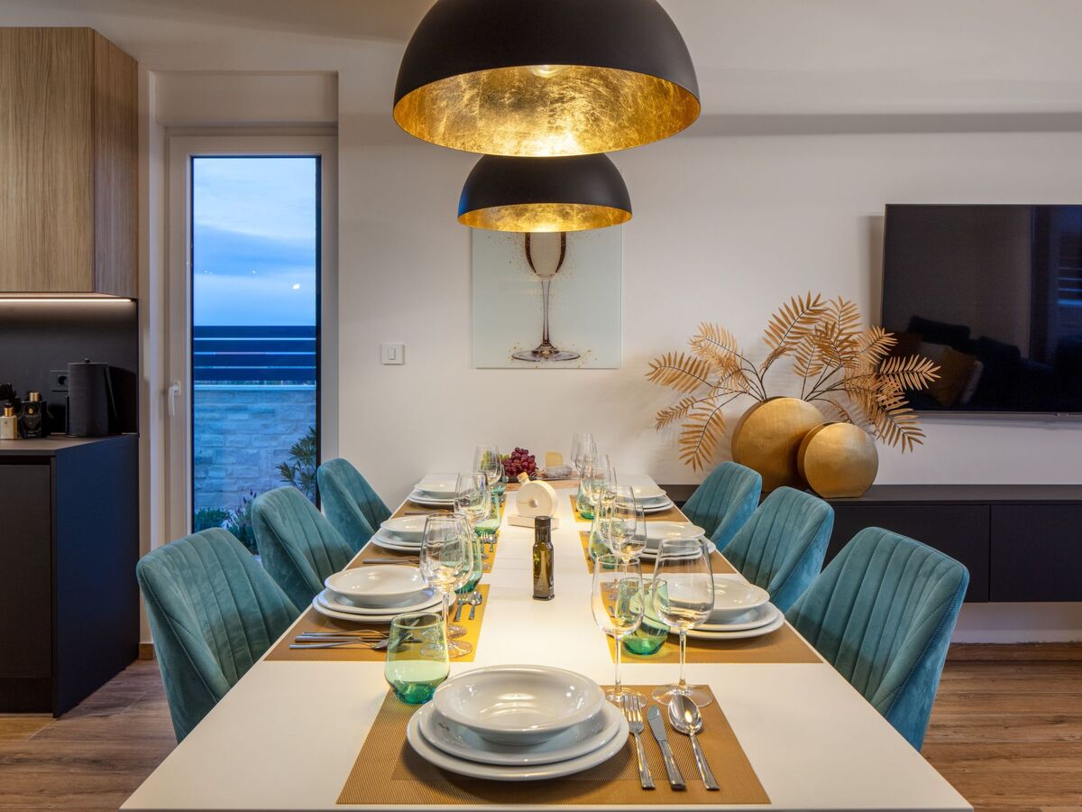 On the roof terrace of the villa, there is a dining area with a fantastic sea view.