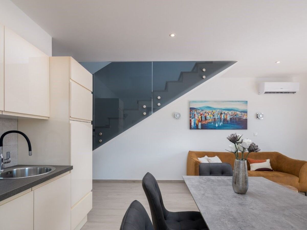The ground floor’s concept is a sunlit open space with a fully equipped kitchen, suited for all your needs; a dining area, which can comfortably accommodate up to 6 guests; a cosy living room and a bathroom.