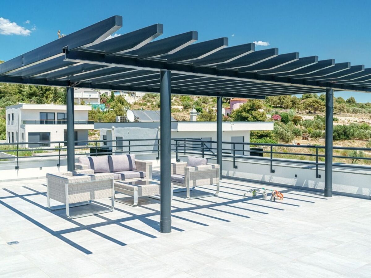 The villa boasts terraces on both floors and an additional one on the roof, all furnished with comfortable lounge furniture.