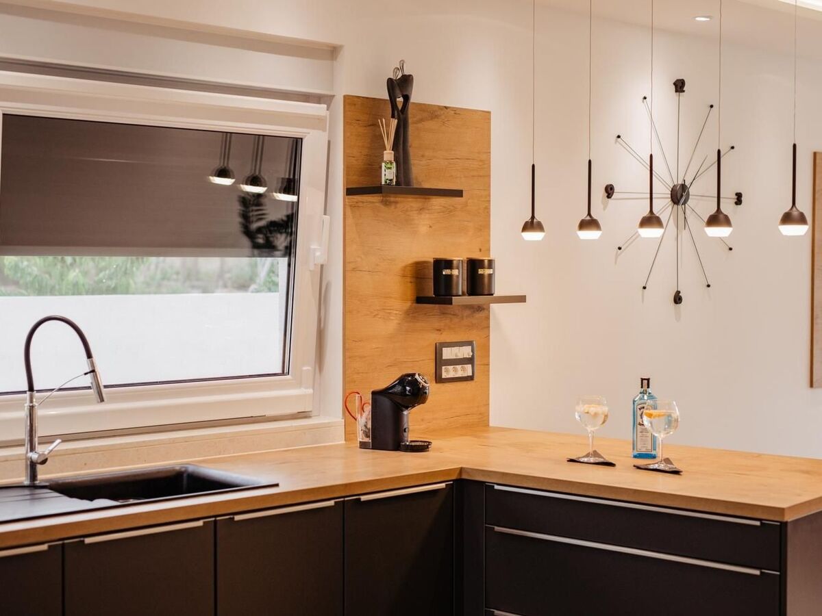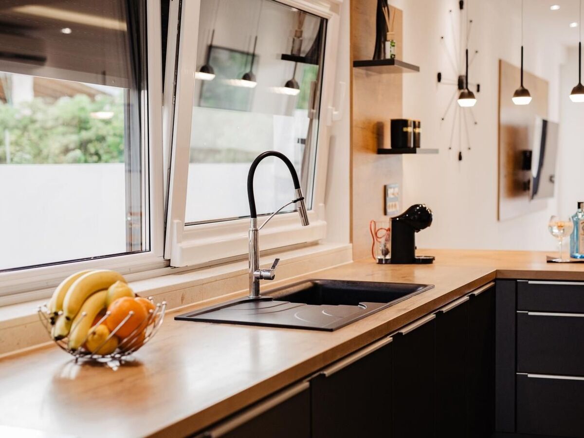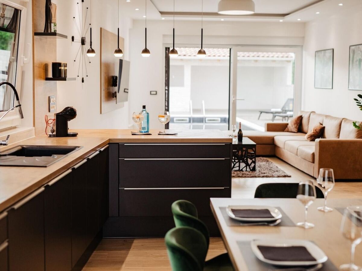 A fully equipped kitchen with a dining area and living room are located on the ground floor of the villa.