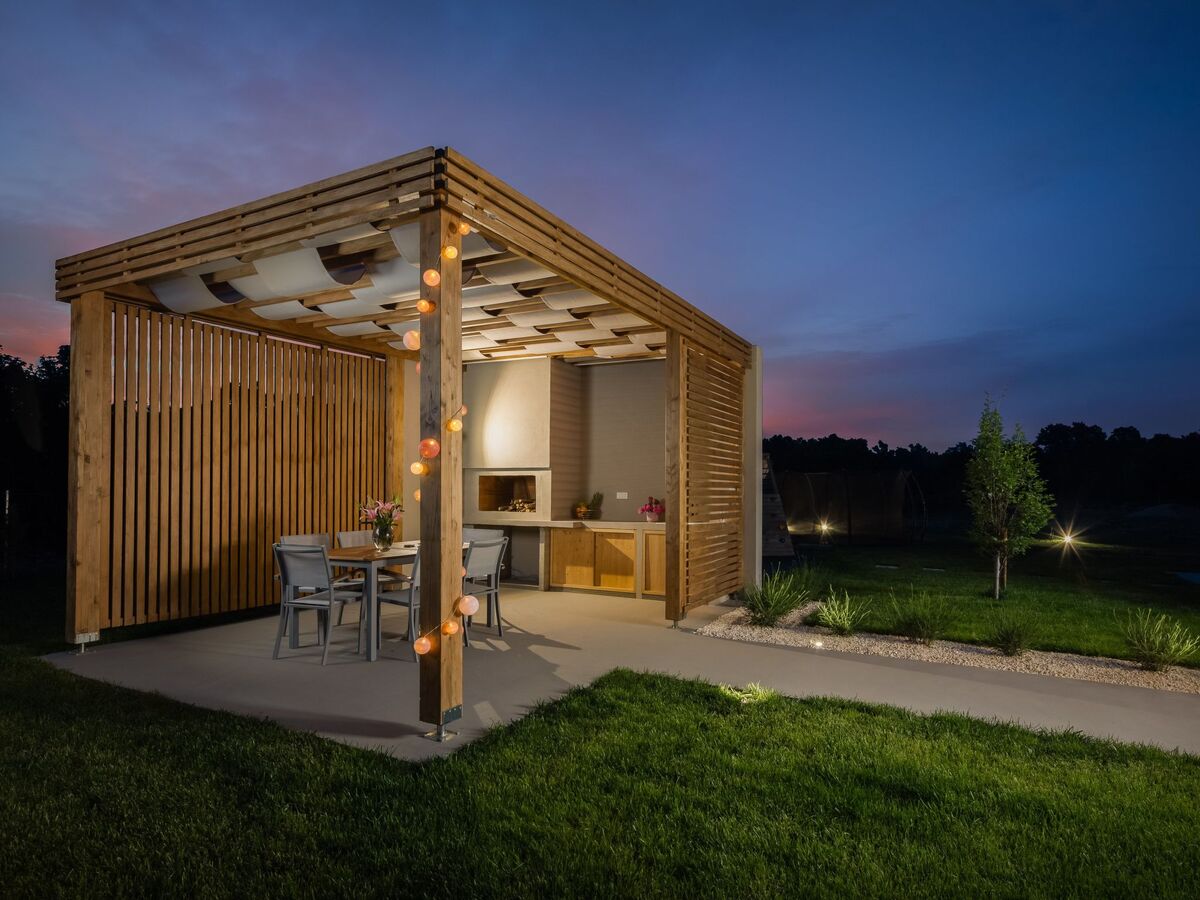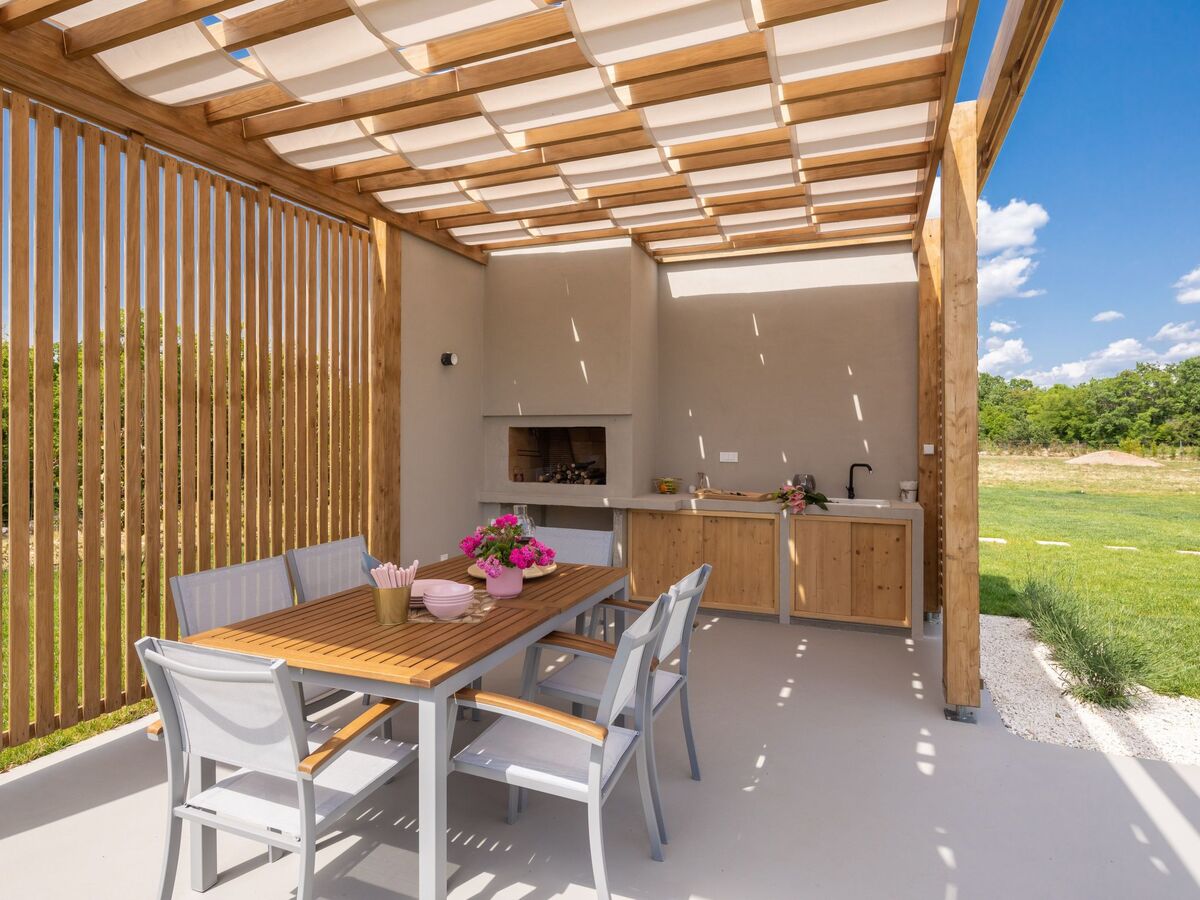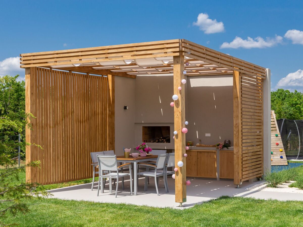 Right by the beautiful outdoor dining area, under a wooden arbour, is the outdoor kitchen with a BBQ.