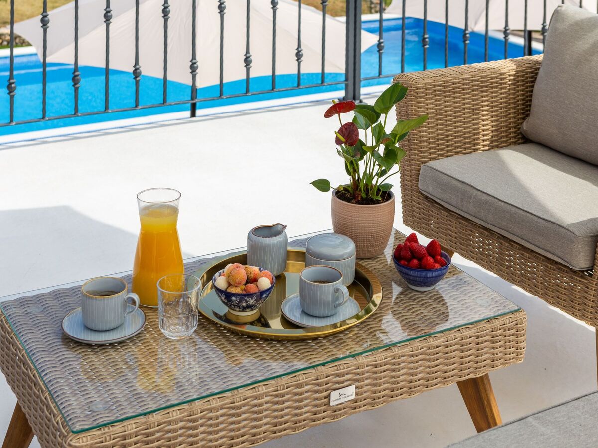 The villa can accommodate up to 8 people in three spacious bedrooms, each with a double bed, private bathroom, air conditioning, and a TV, as well as a baby cot.