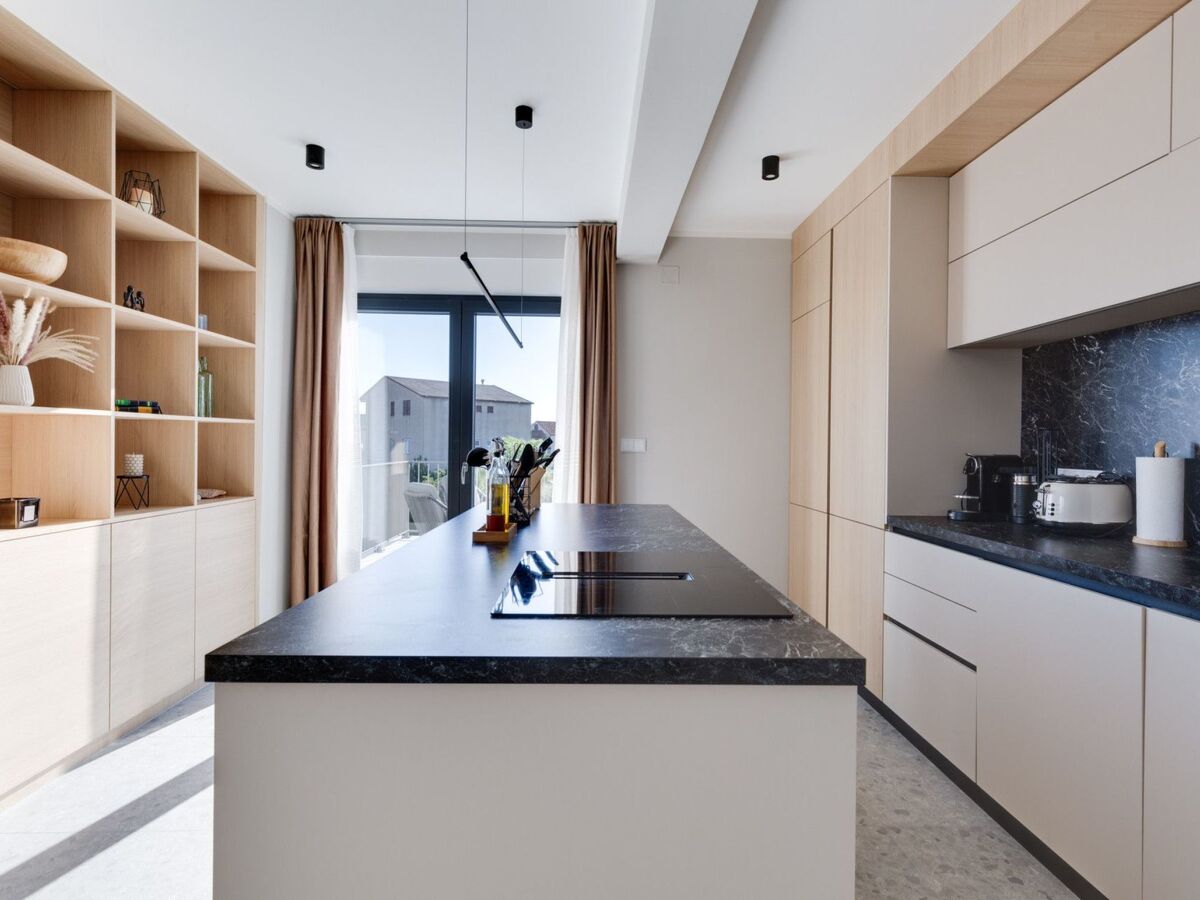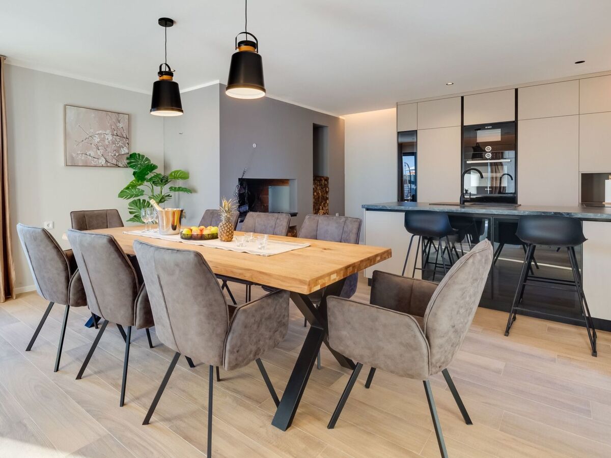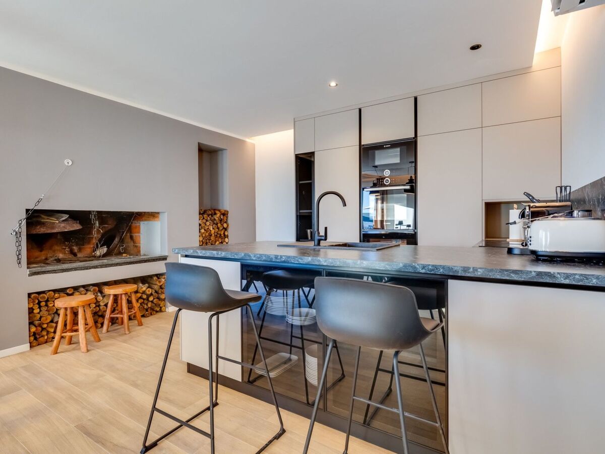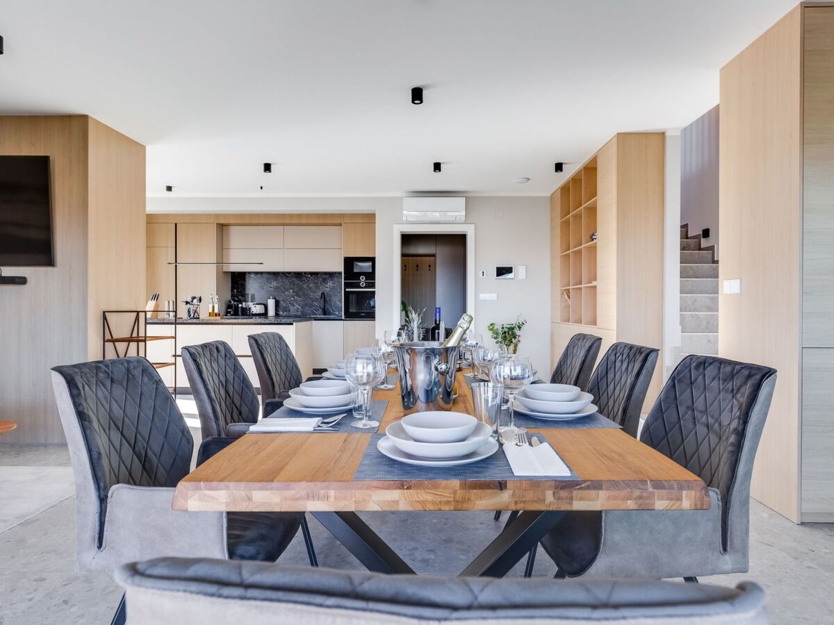 On the ground floor, there is a fully equipped kitchen with a wood-burning fireplace and a kitchen island, along with a dining table where you can enjoy your meals overlooking the pool.