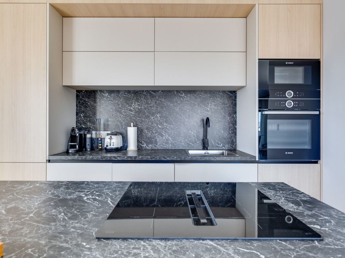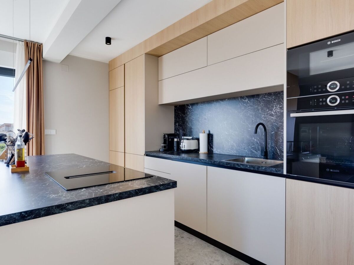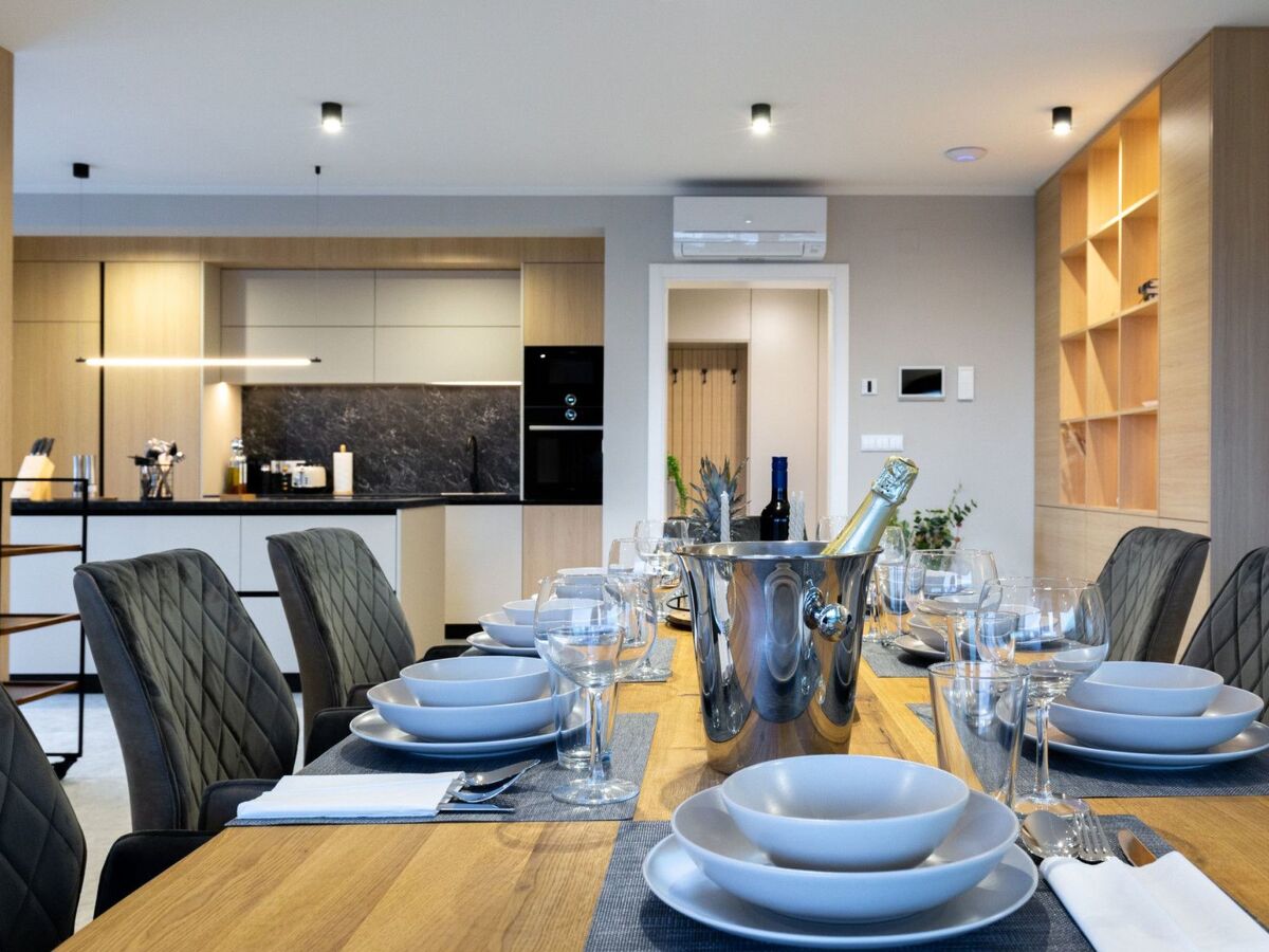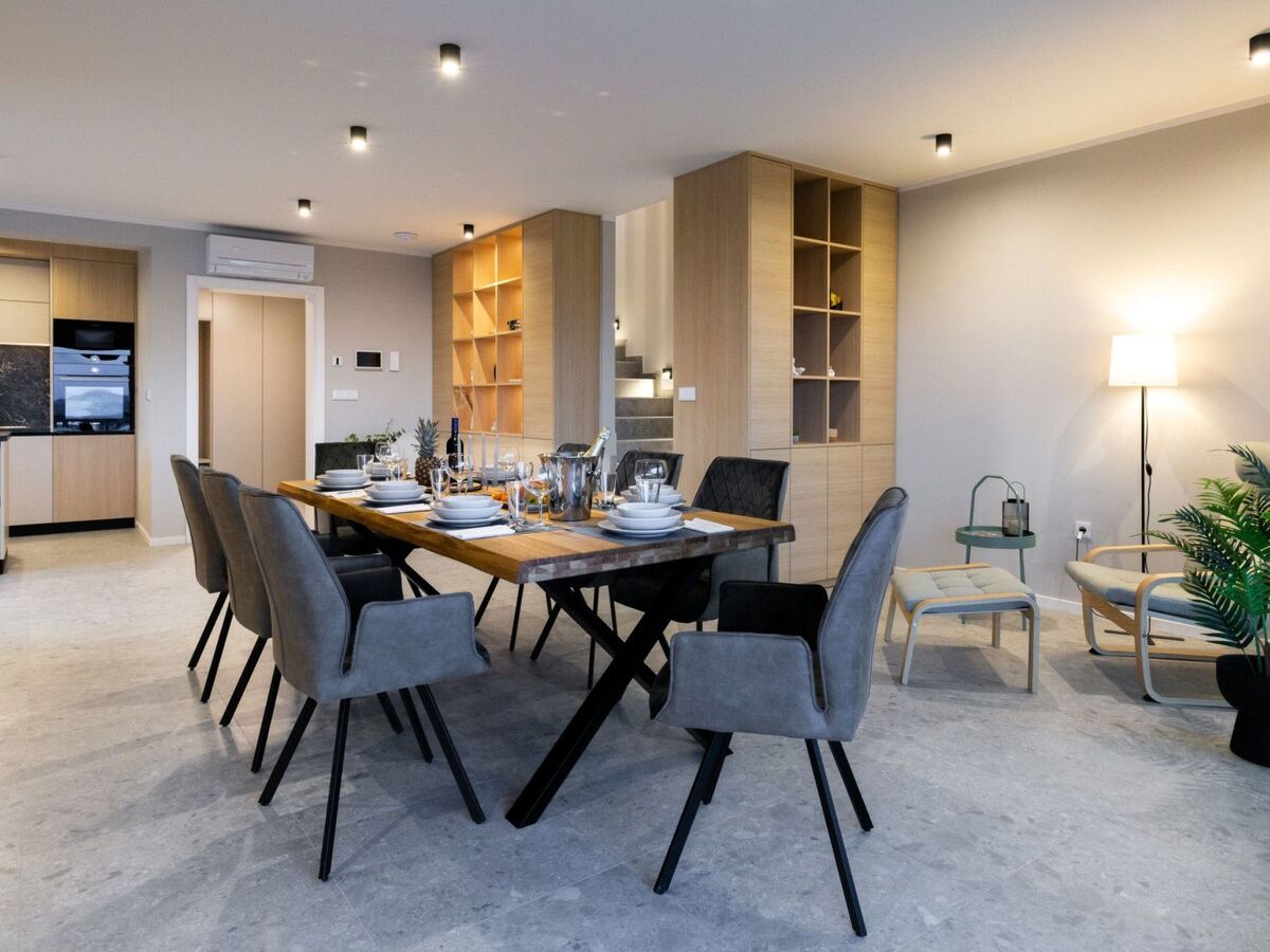 On the ground floor, there is a fully equipped kitchen with a wood-burning fireplace and a kitchen island, along with a dining table where you can enjoy your meals overlooking the pool.