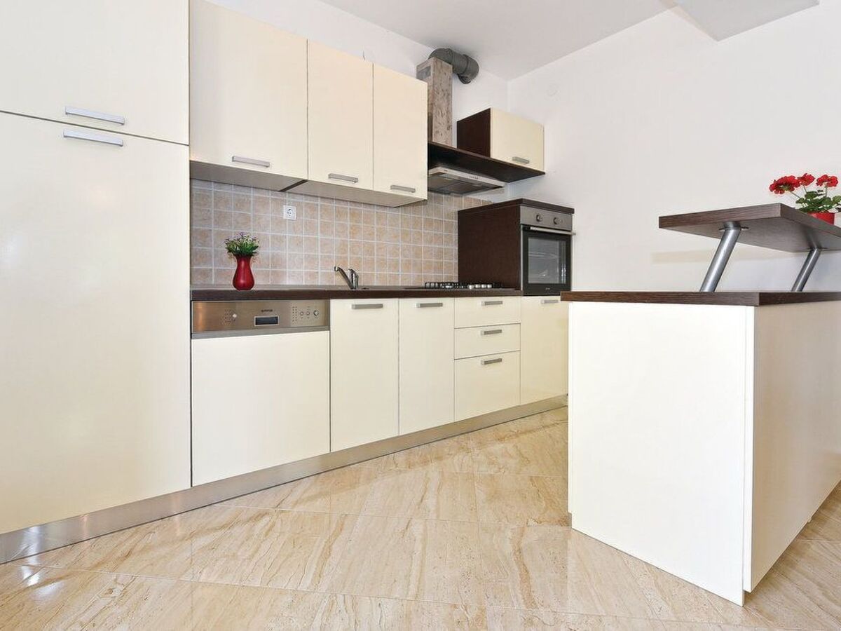 Despite the absence of underfloor heating, air conditioning units ensure a comfortable temperature throughout the property, while the kitchen with a gas stove, dishwasher and filter coffee machine is available for preparing meals.