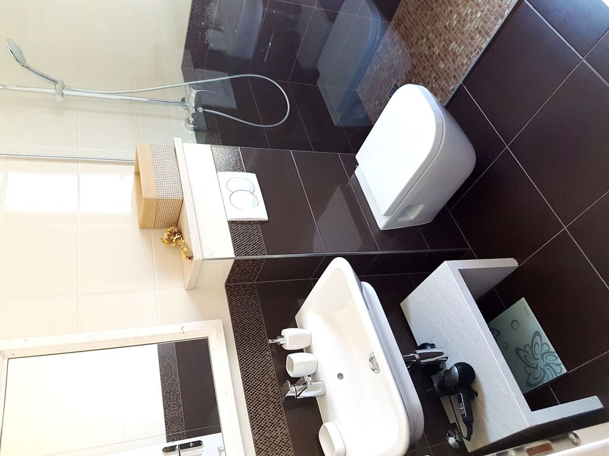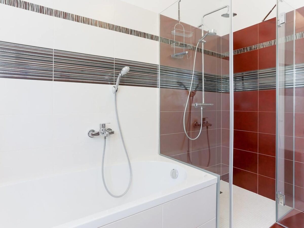 There is a bathroom with a WC, bath and shower and a double washbasin, and another bathroom with a shower and WC.