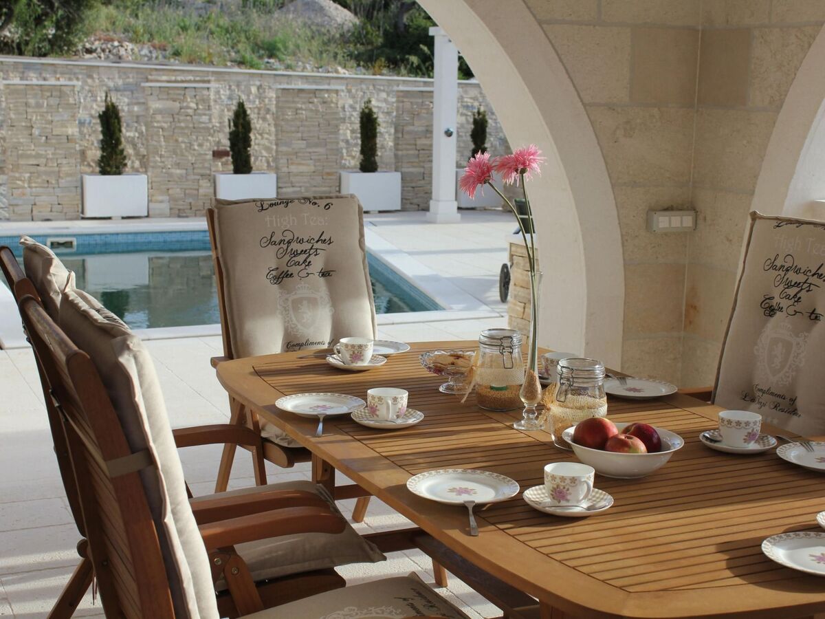 The kitchen and dining room provide access to the terrace and the pool, while the living room opens onto the loggia.