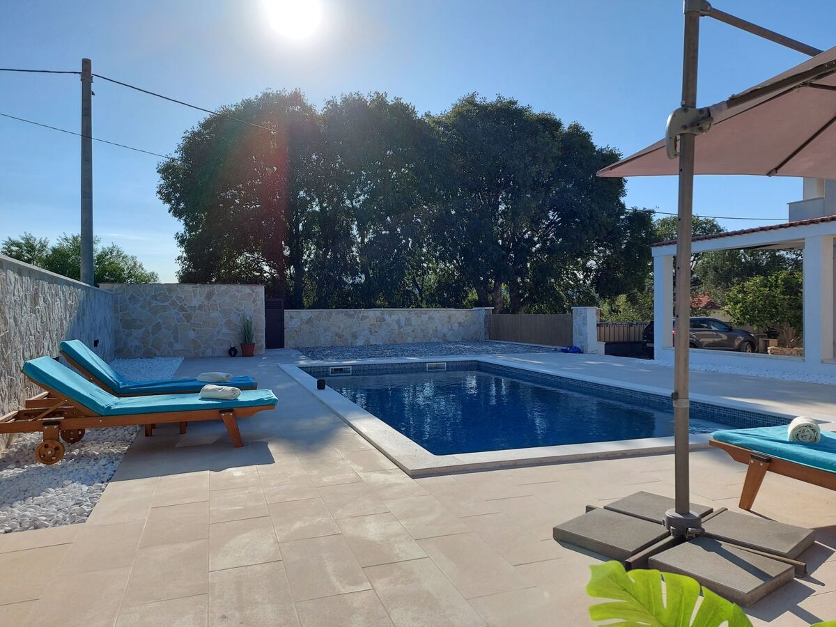 Outdoor with wood fired grill/barbecue, swimming pool with sun loungers a sunshade for sole use, parking places for two cars.