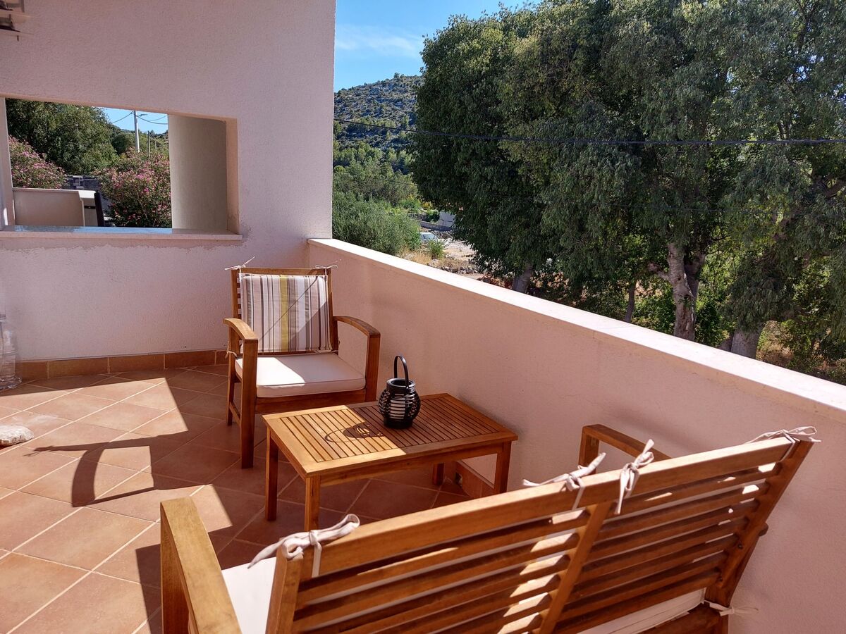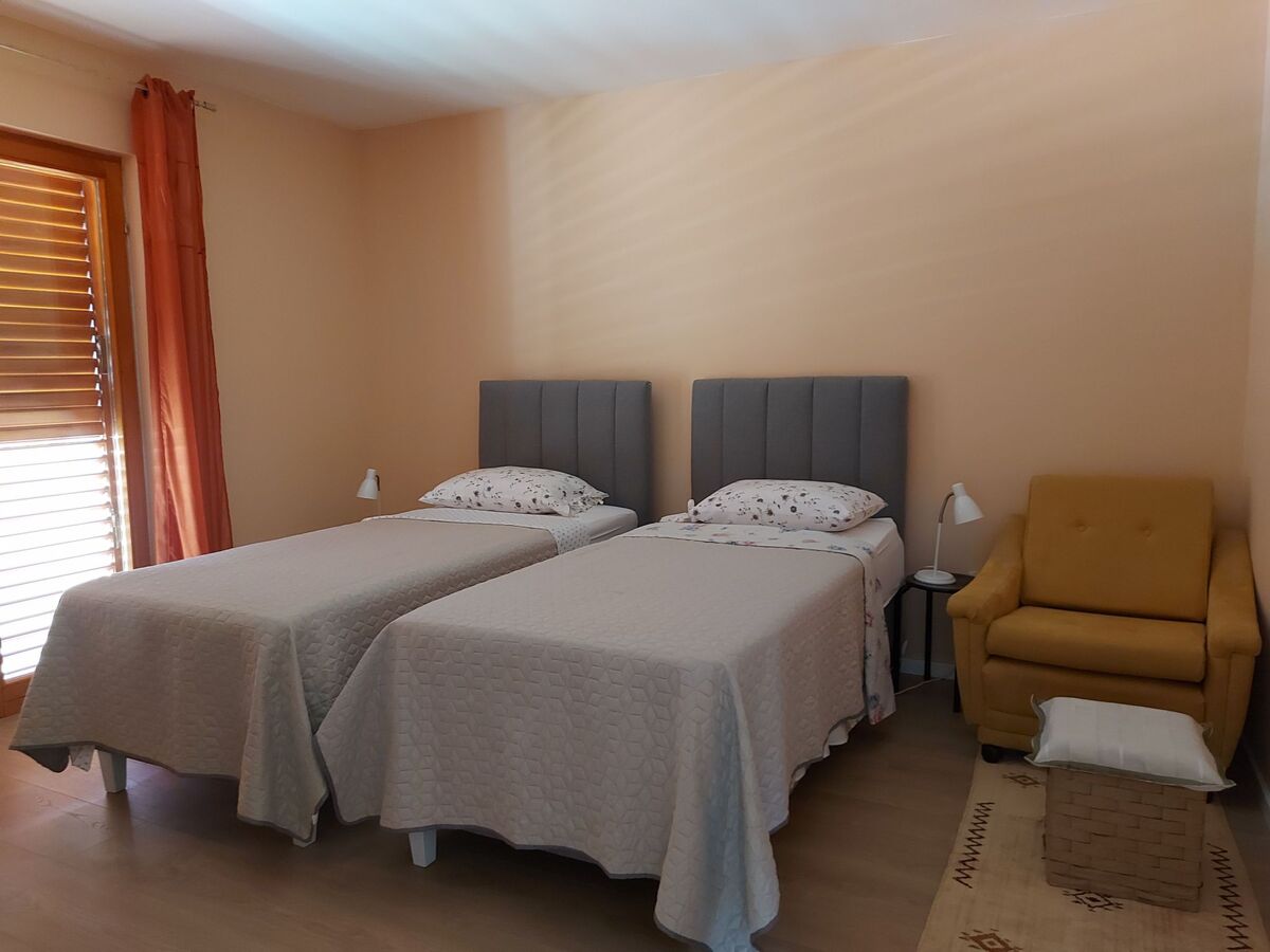 The apartment on the first floor is about 90m2 in size and comprises of the following rooms: Sleeping room 1, with own balcony and outdoor furniture, a king size double bed (1.80 m wide), and sleeping room 2, with one king size bed (1.80 m wide) which can be converted in two single beds.