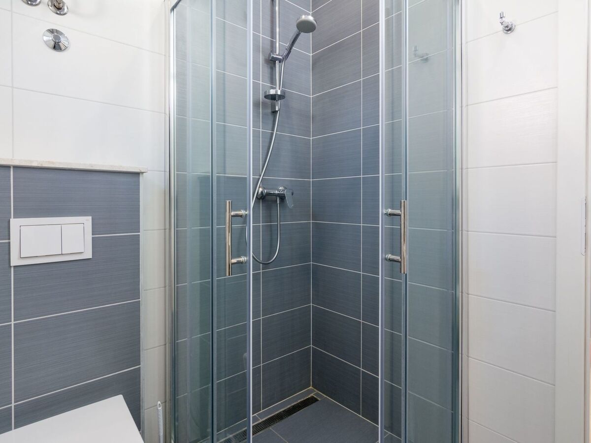 The modern bathroom with grey and white tiles is fitted with a shower, WC and washbasin.