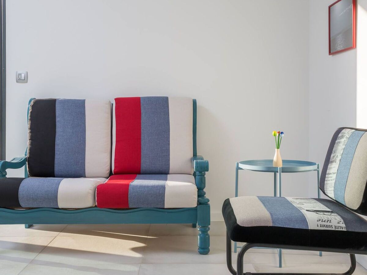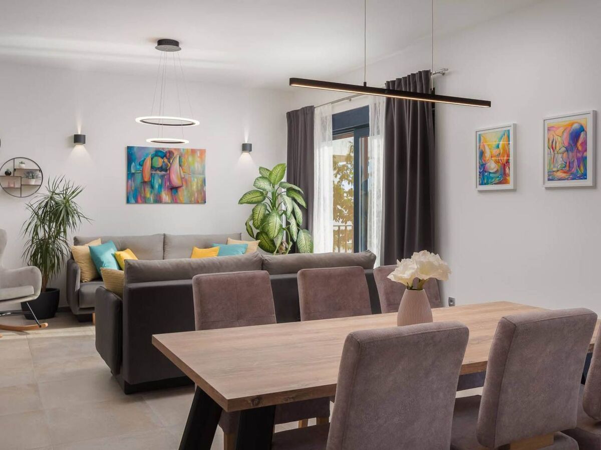 The first floor consists of a spacious and modern fully equipped open concept kitchen, dining area with table and chairs for 6 persons and a living room.