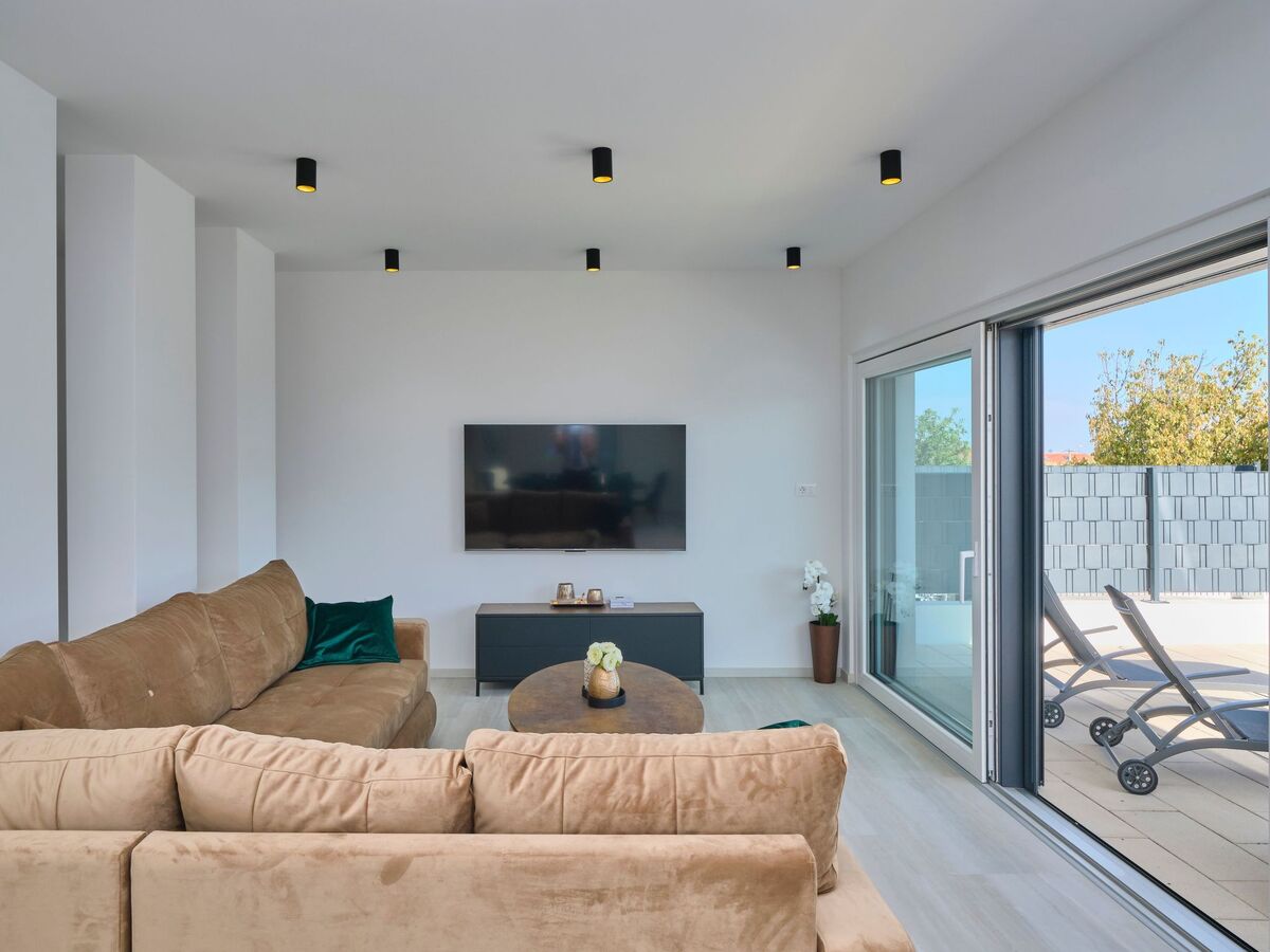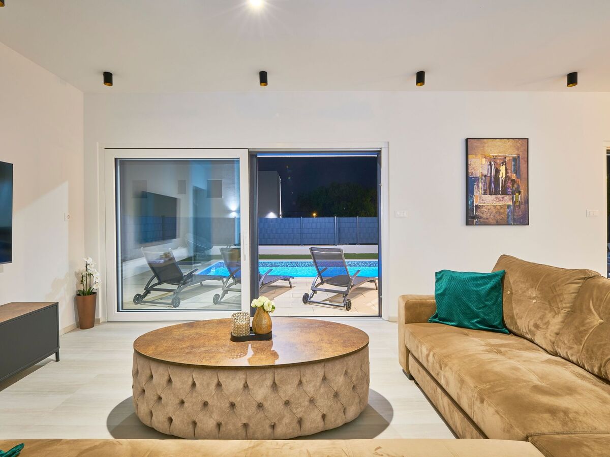 The ground floor features a spacious and comfortable living room with a smart TV and a pool area exit.