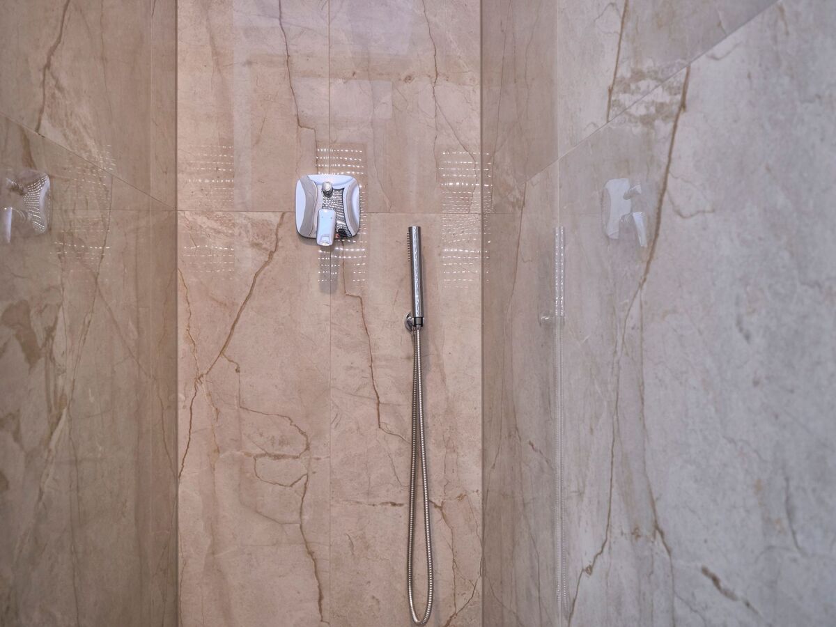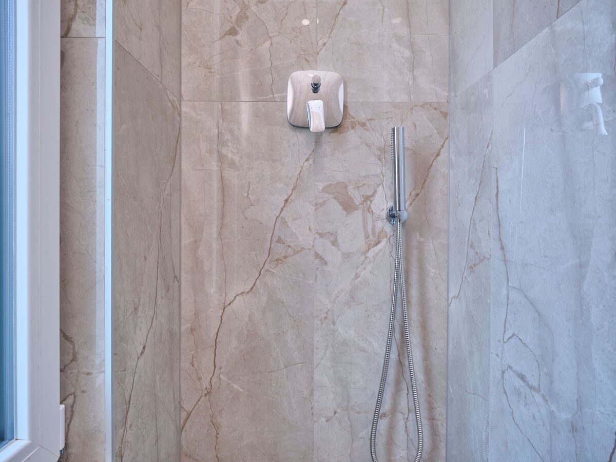 Spanning two levels, the villa features a ground floor and an upper floor, with each bedroom equipped with its own bathroom, shower, and air conditioning.