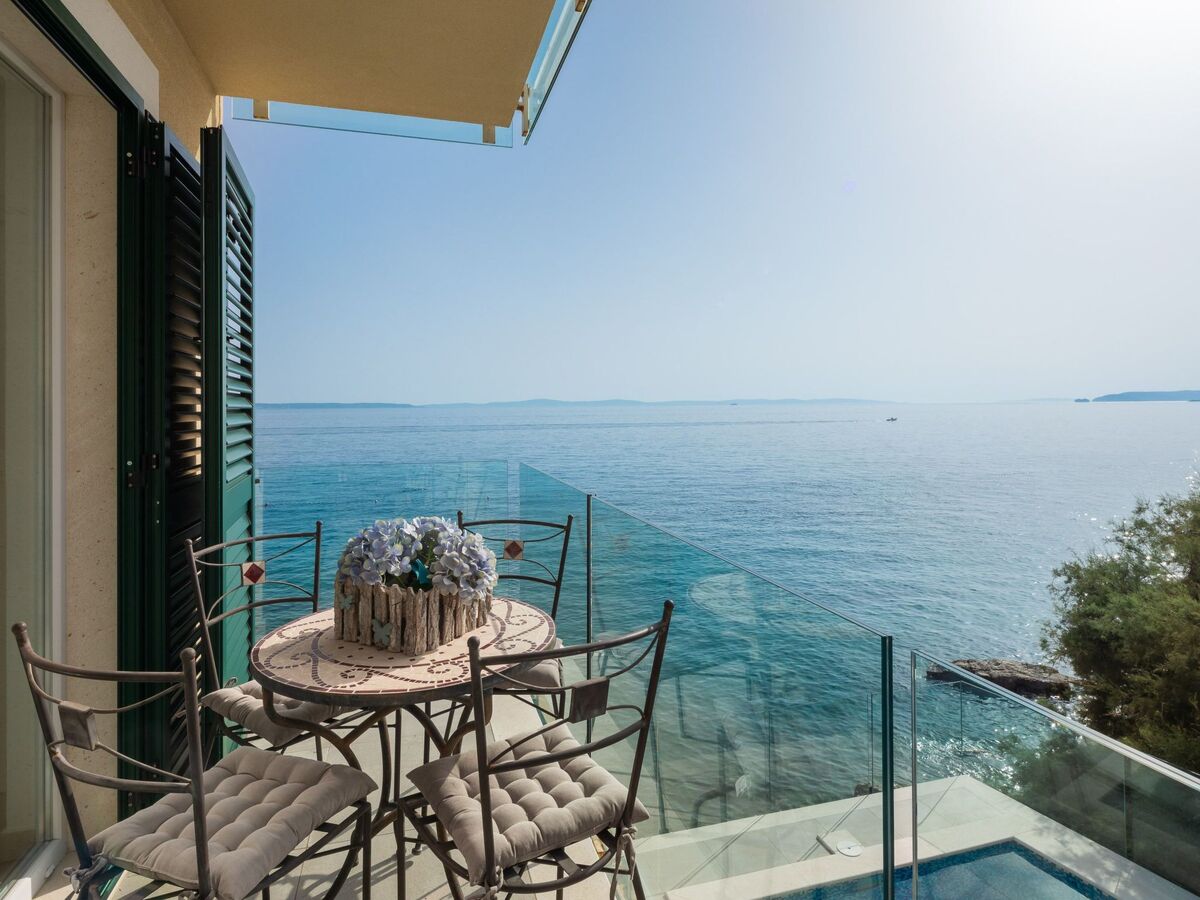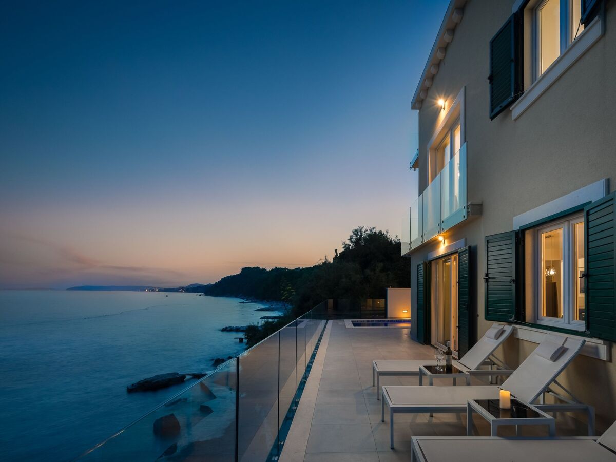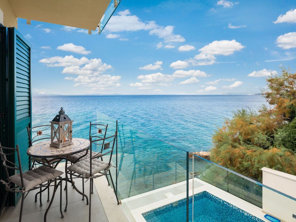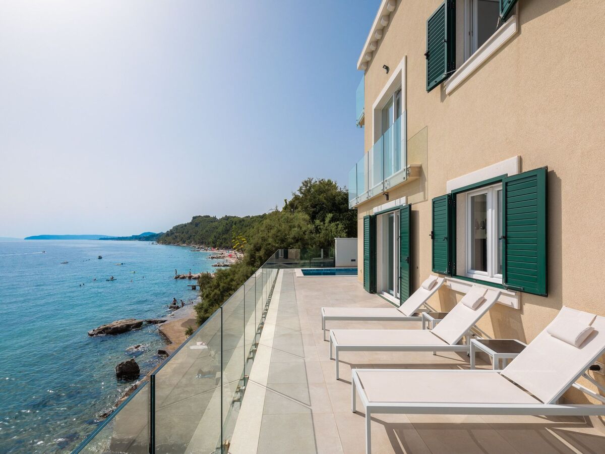 Moving to a terrace, there is a pool and furnished pool area with sunbathing chairs and stunning sea view.