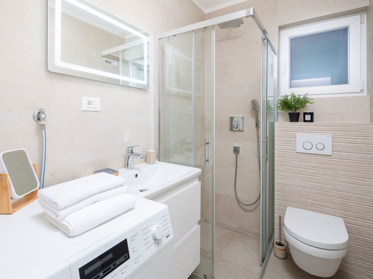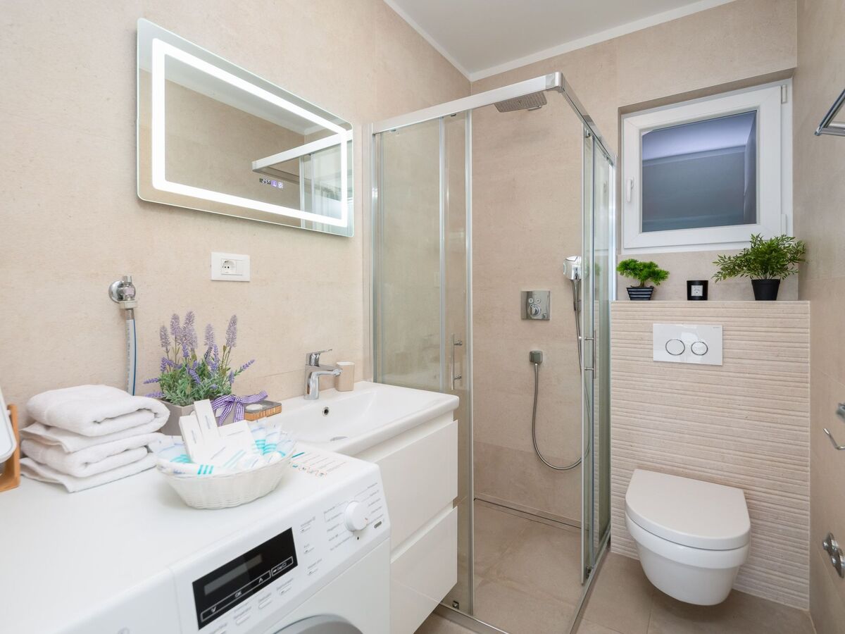 There are three bathrooms with shower, two washing machines and clothes dryer.