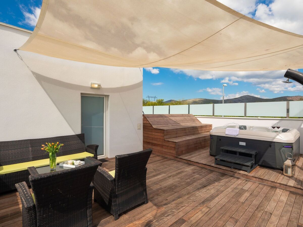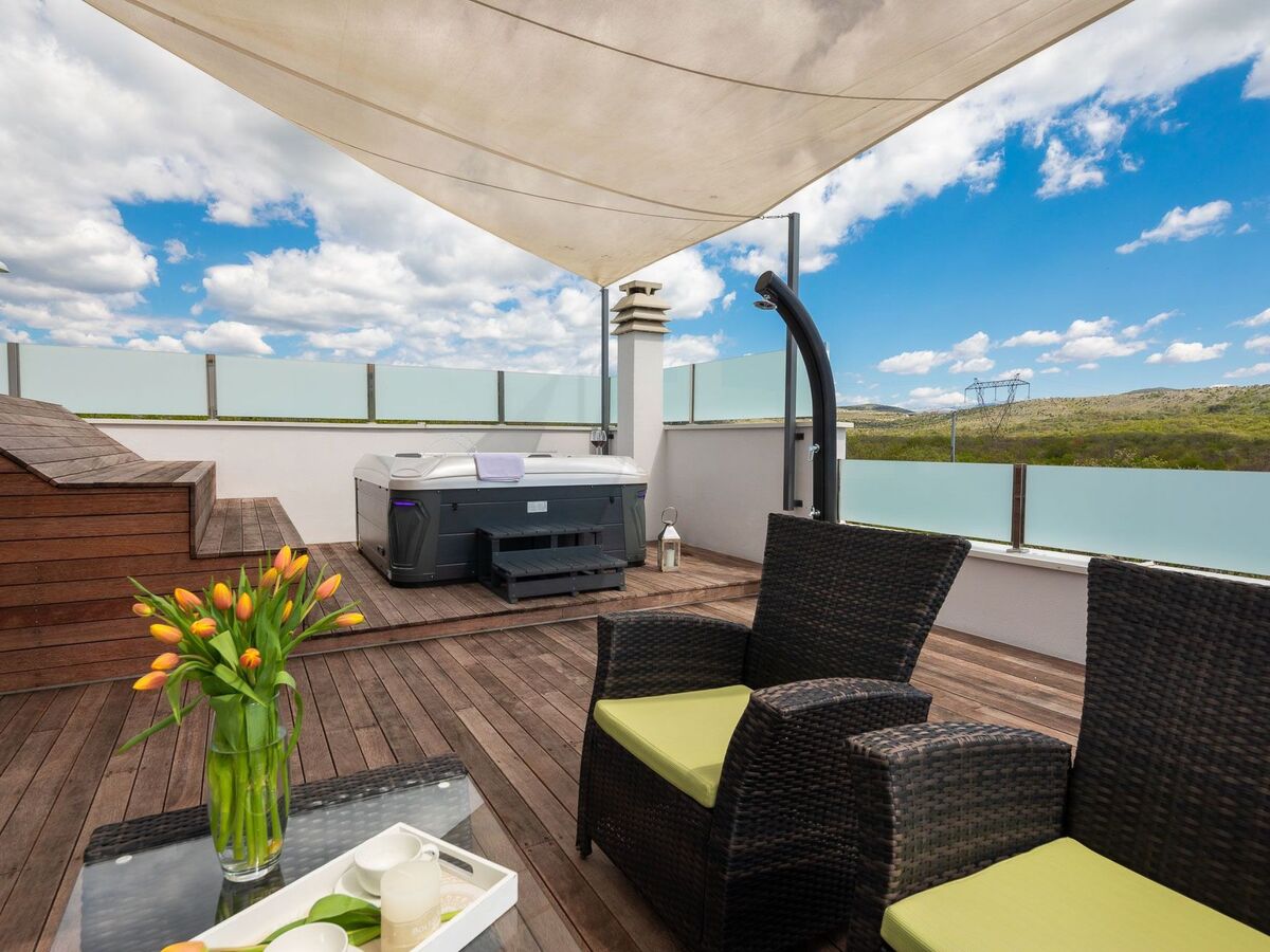 From the play room you can enter the two terraces, one with wooden floors and a jacuzzi and other is ideal for sunbathing and enjoying a view on a sunset and idyllic green hills.