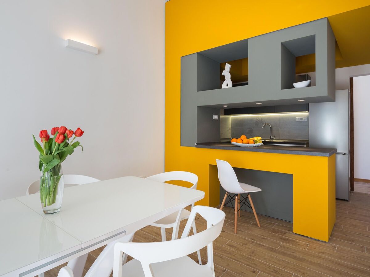 The right villa wing on the ground floor has a bathroom, kitchen-dining-living area with direct acces to the terrace by the pool with lounge furniture.