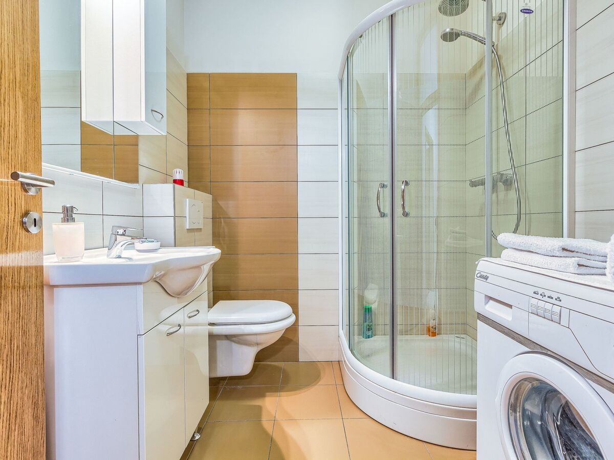 The three bathrooms each have a spacious shower cubicle, a washbasin with a wall mirror, a hairdryer and a toilet.
