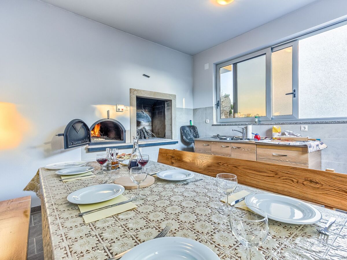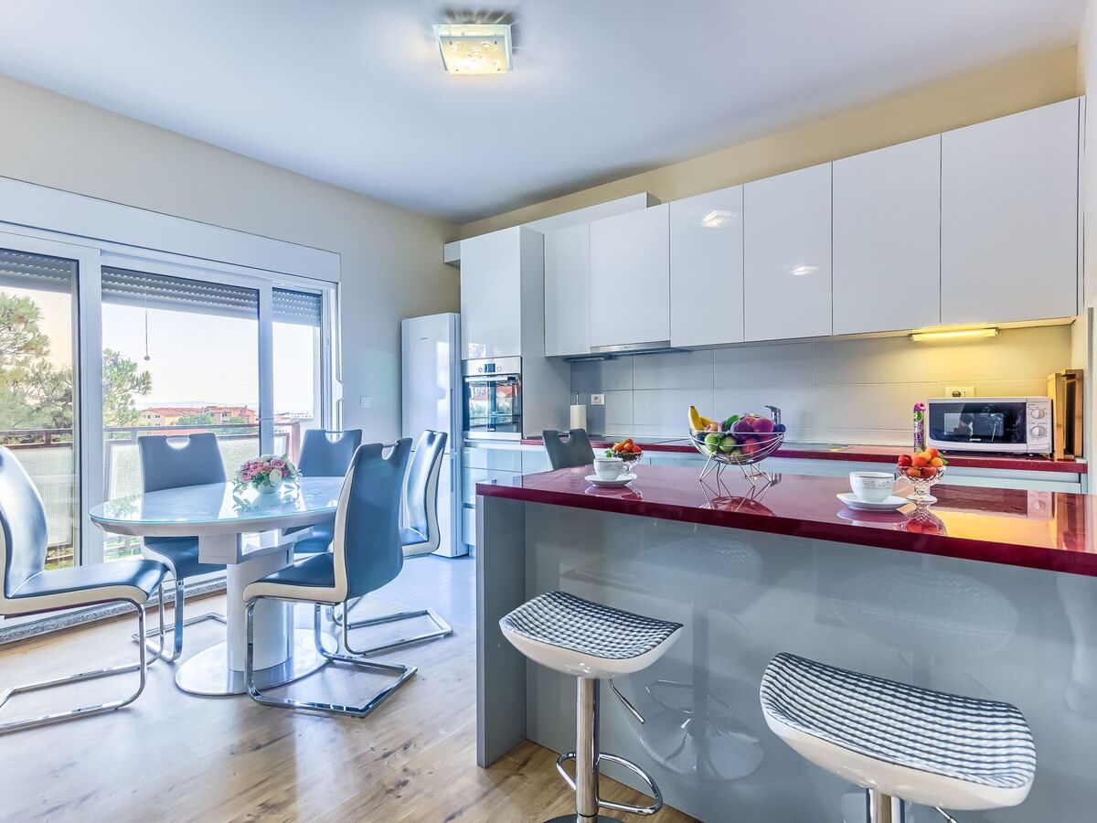 An elegant breakfast bar separates the dining space from the built-in kitchen, comprising a dishwasher, a ceramic hob with an extractor fan, an electric oven, a fridge with a freezer compartment and ample crockery and cutlery.