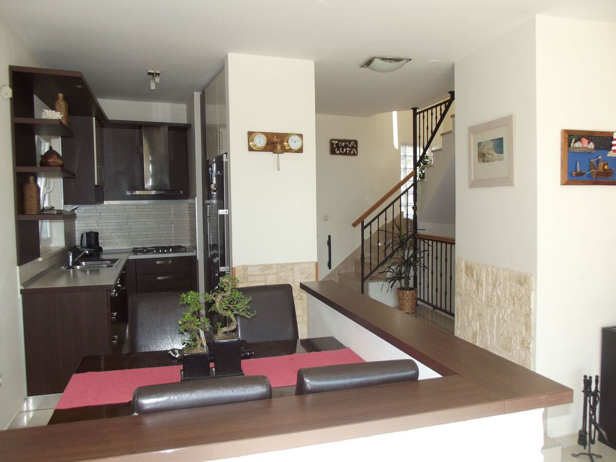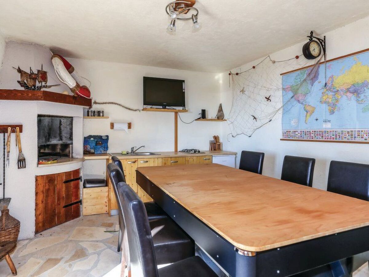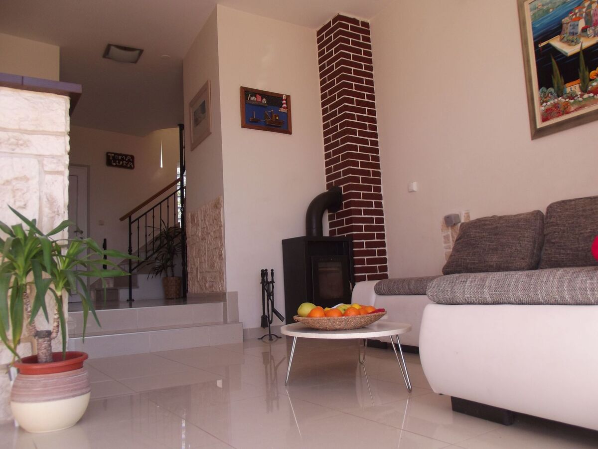 On the ground floor, you'll find the air-conditioned (heating and cooling) living area with a large corner sofa, a wall-mounted flat-screen TV with satellite channels, a DVD player, a stereo system, and a cast-iron fireplace for cozy warmth on cooler evenings.