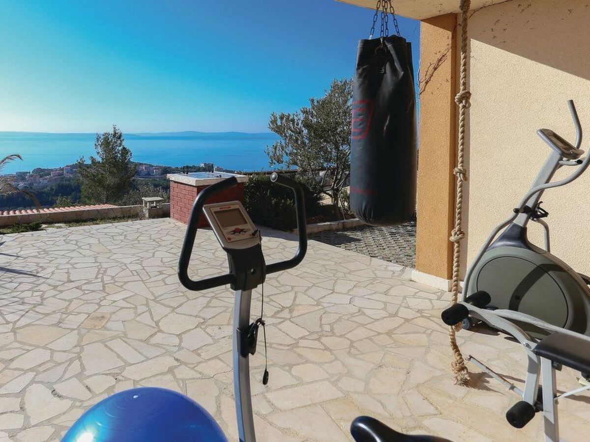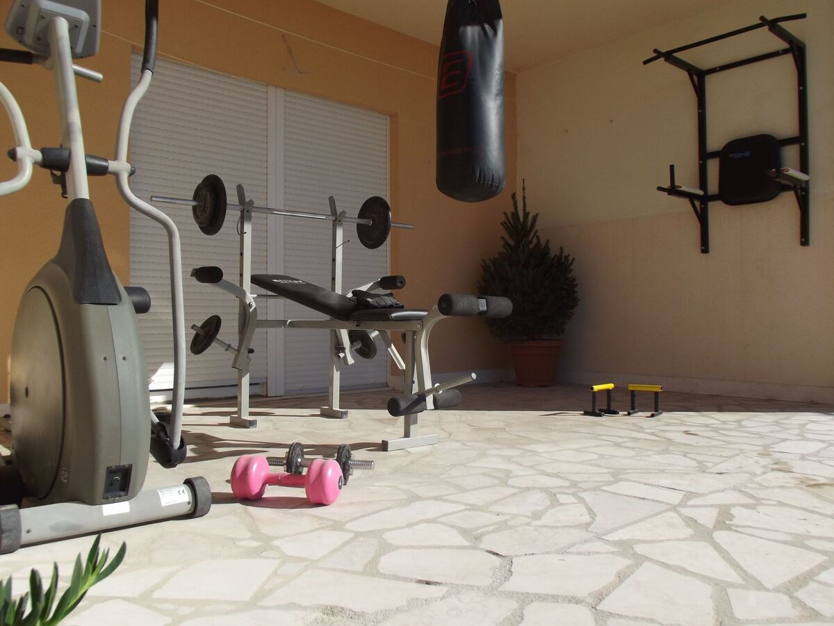 The more active vacationers among you can let off steam on the spacious terrace, which is equipped with fitness equipment (exercise bike, press bench, dumbbells and weights, and even a kickboxing punching bag).