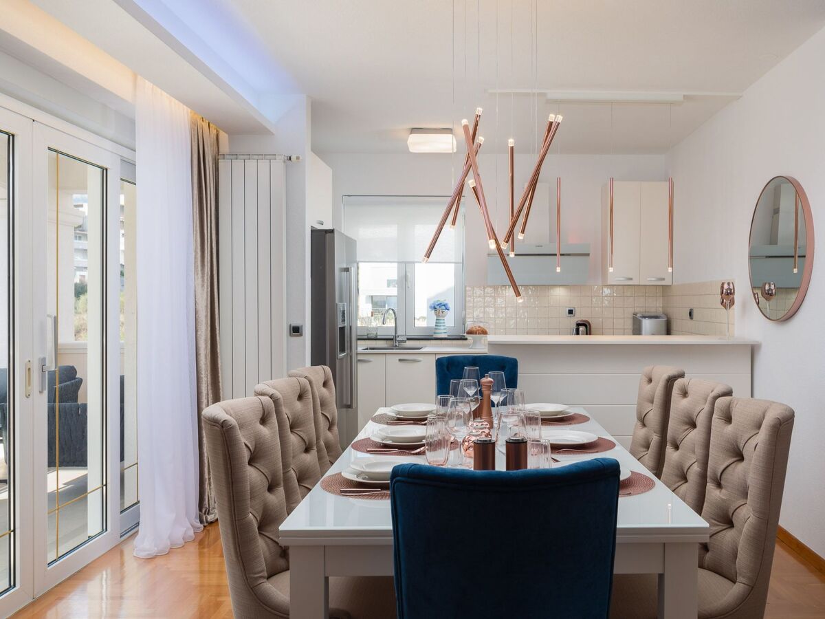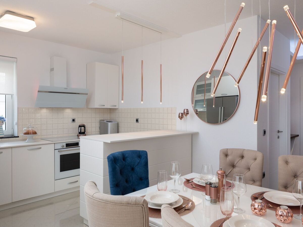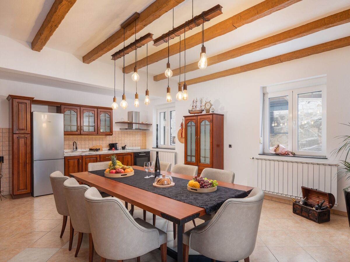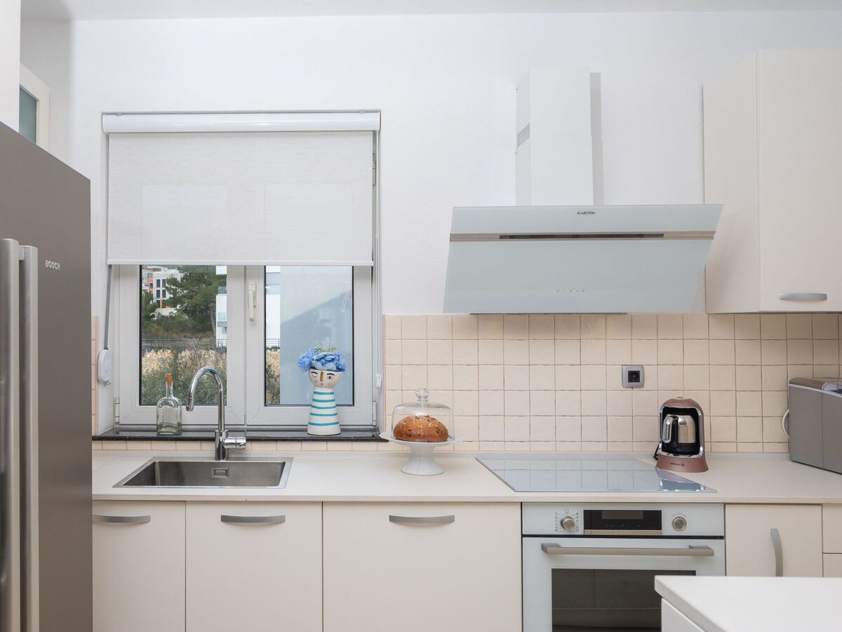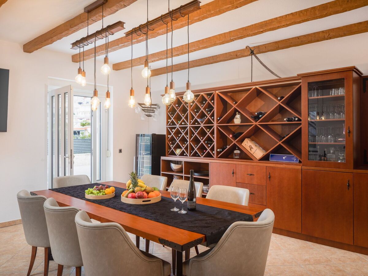 Moving to the ground floor of the villa, you will have at your disposal a fully equipped kitchen with stove top, oven, fridge, dishwasher and other kitchen utilities with a dining area and one bathroom.