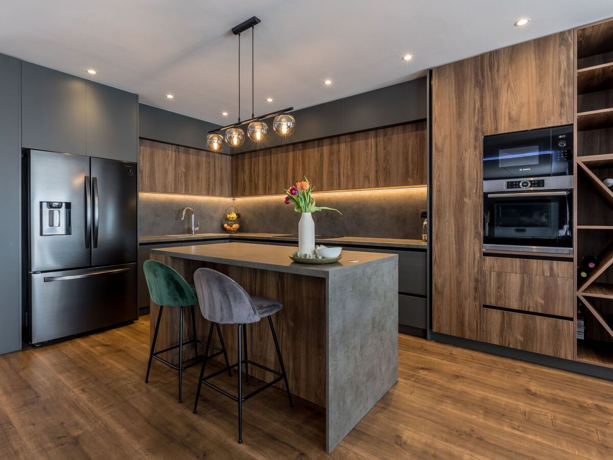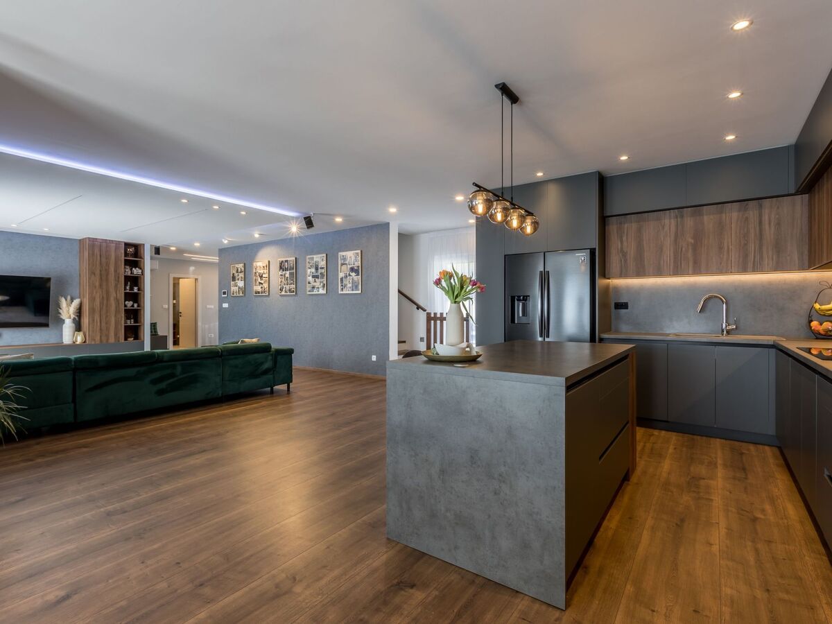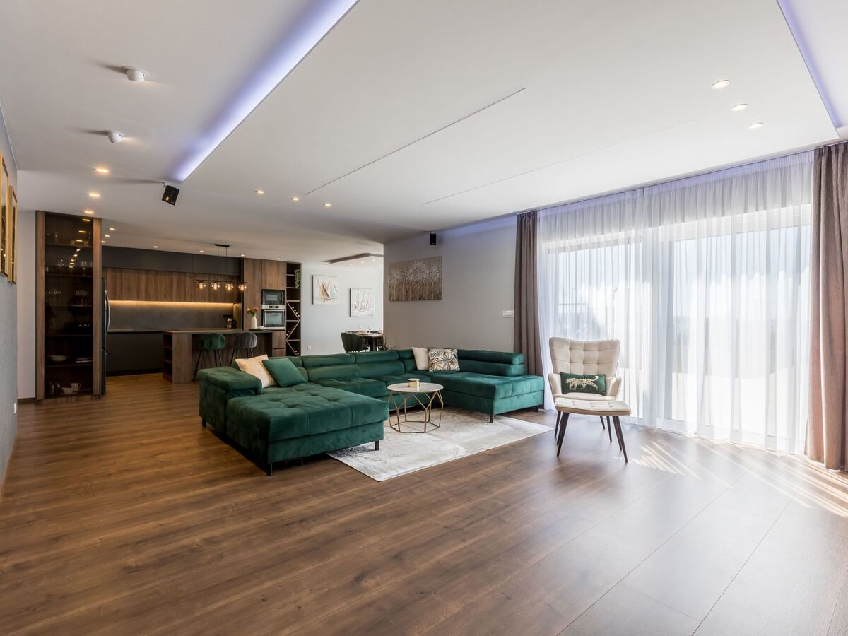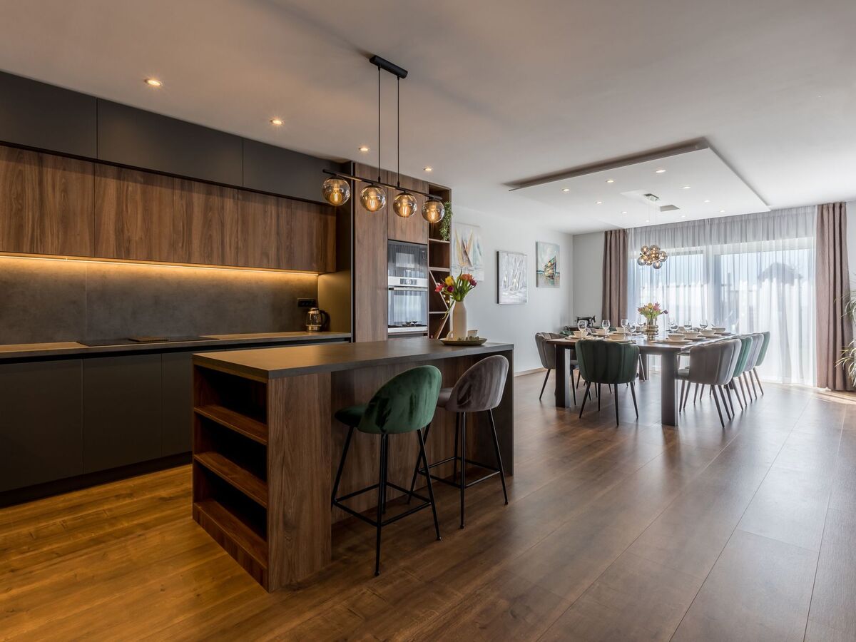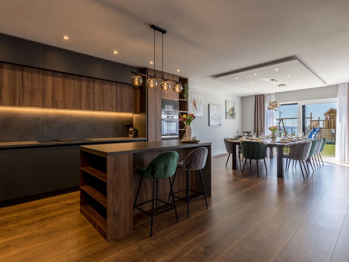 The living room, equipped with a games console, extends into a fully equipped kitchen, featuring modern appliances such as a Ceran hob, coffee machine, dishwasher, and an electric kettle, promising delightful culinary experiences.