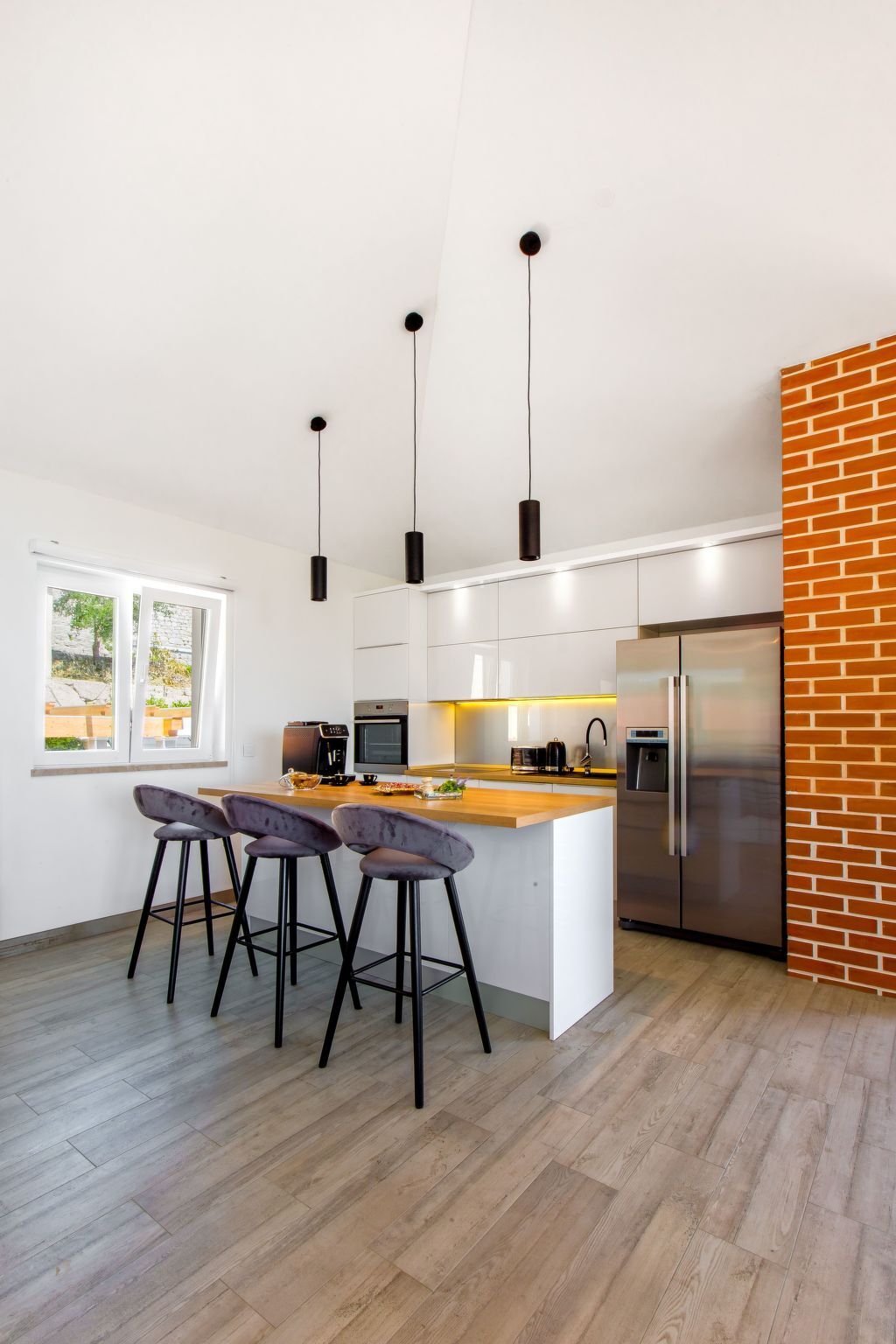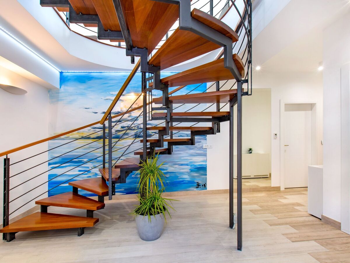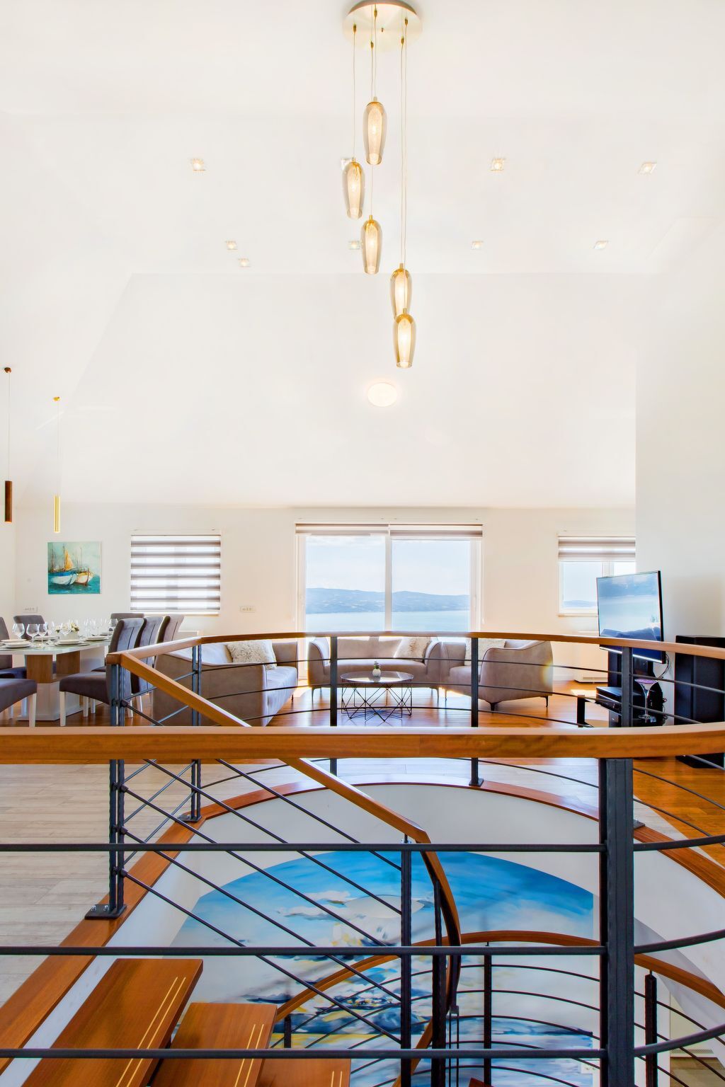 Un escalier en colimaçon mène au deuxième étage de la maison, où se trouvent une cuisine entièrement équipée avec un coin repas, un salon confortable avec deux canapés et un fauteuil, une télévision à écran plat et une vue imprenable sur la mer.