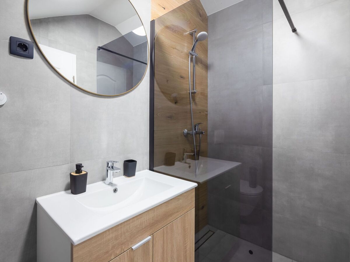 Zone de propriété : piscine extérieure, douche extérieure, aire de bronzage avec chaises longues, barbecue et mobilier d'extérieur.