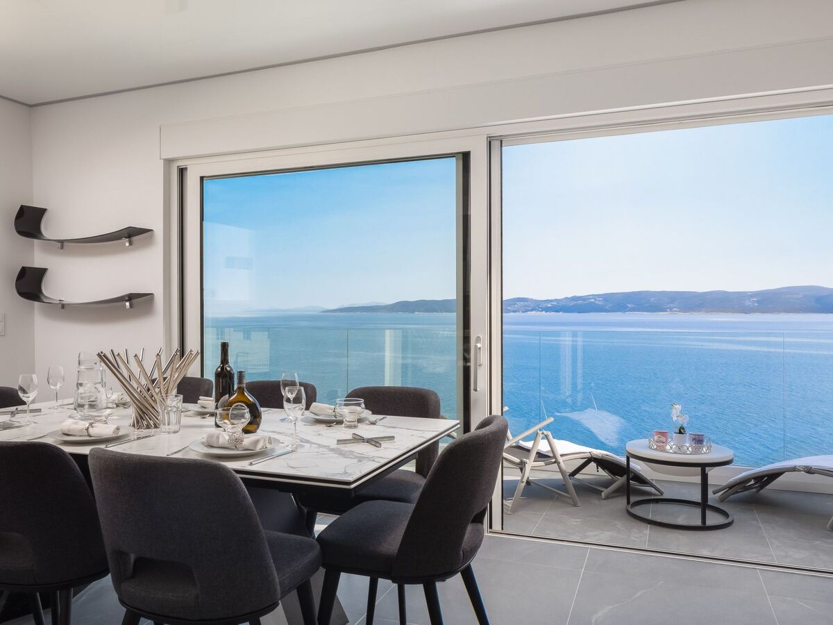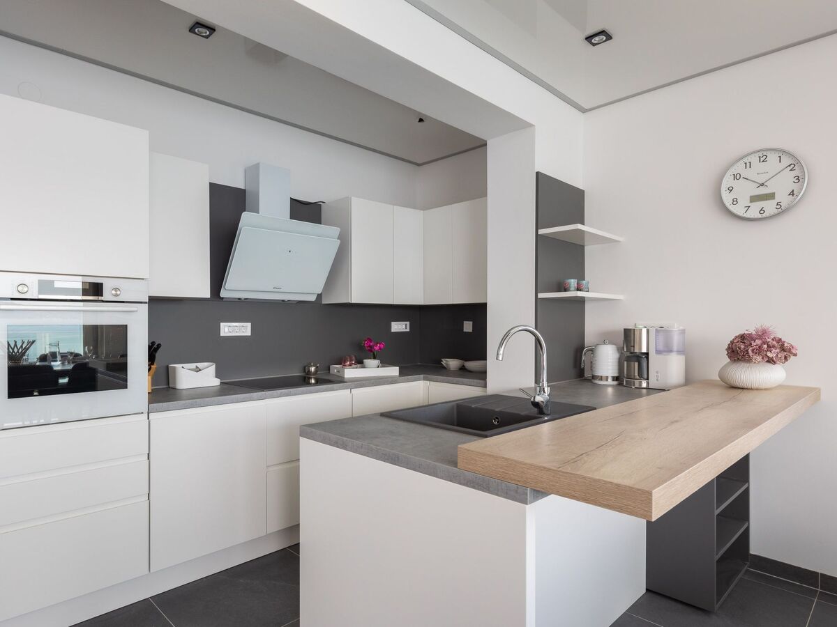 From there, you access the dining area and kitchen with large windows overlooking the sea, and a fully equipped kitchen (a refrigerator, oven, microwave, dishwasher, coffee maker, etc.) with a seating area and an office space.