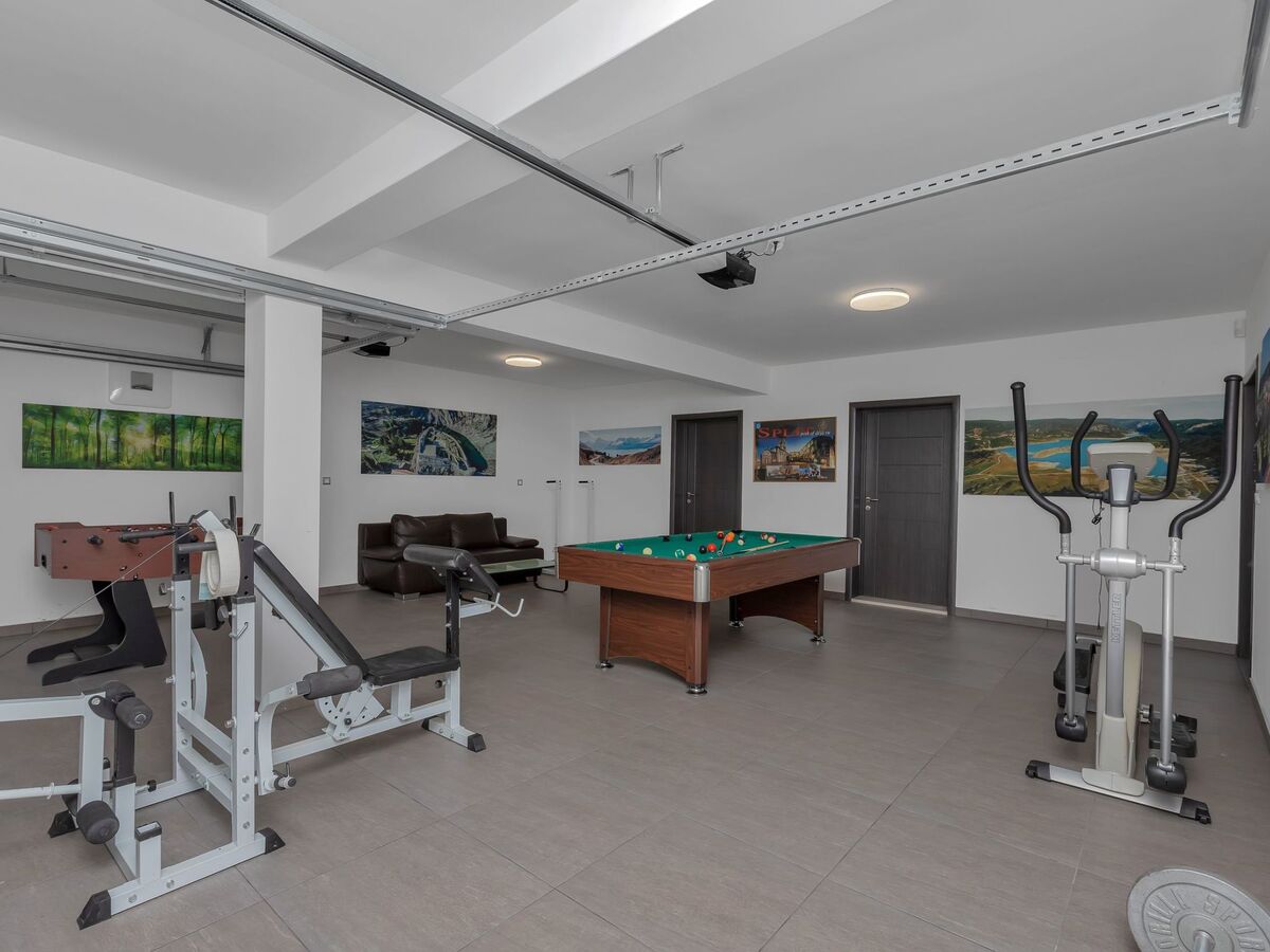 On the ground floor there is a fitness room and lounge (sauna, billiards, table football, etc.) On the first floor there is a large flat (130m²) with a large living and dining area.