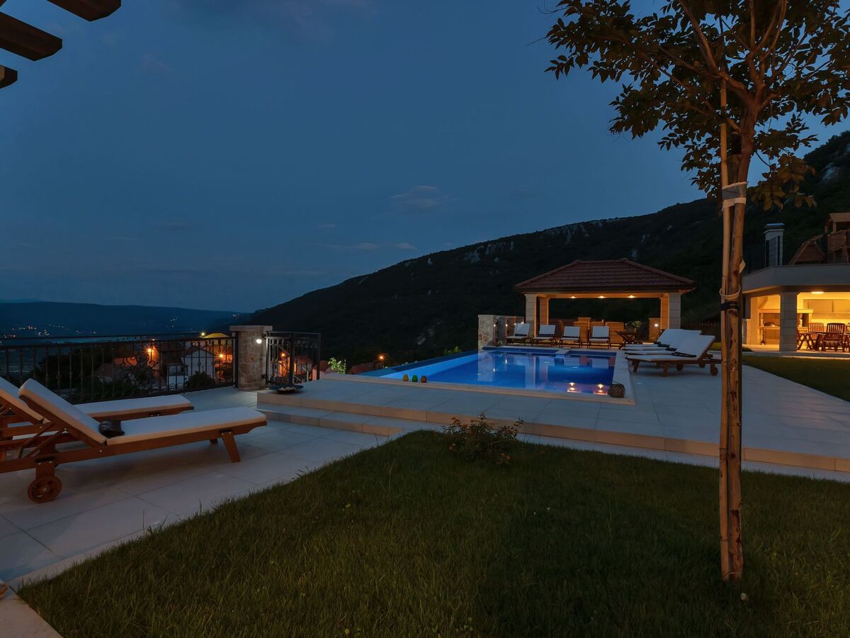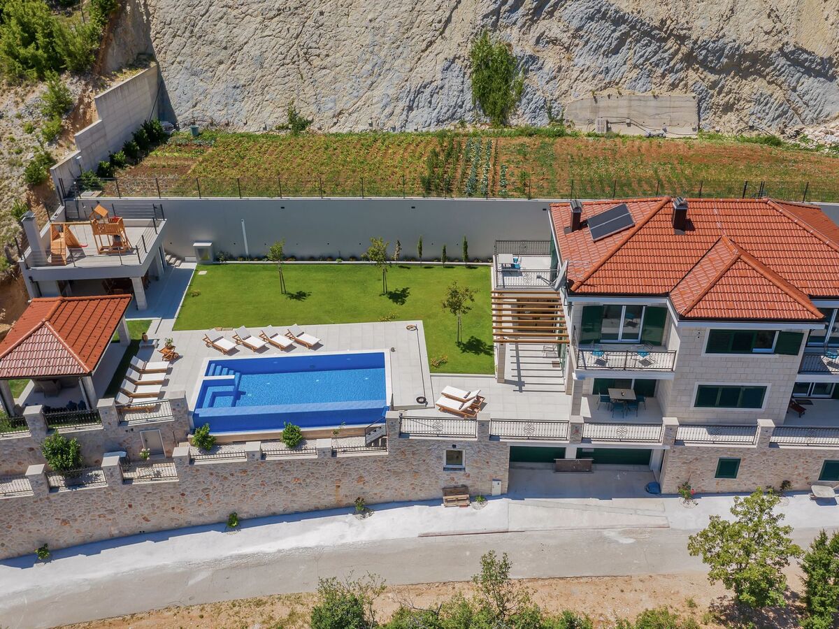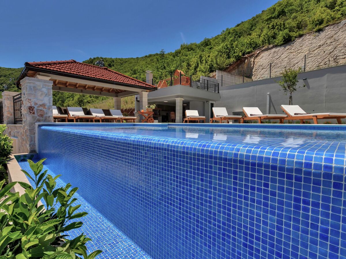 The infinity pool has an outdoor shower and a massage bench for 4 people.