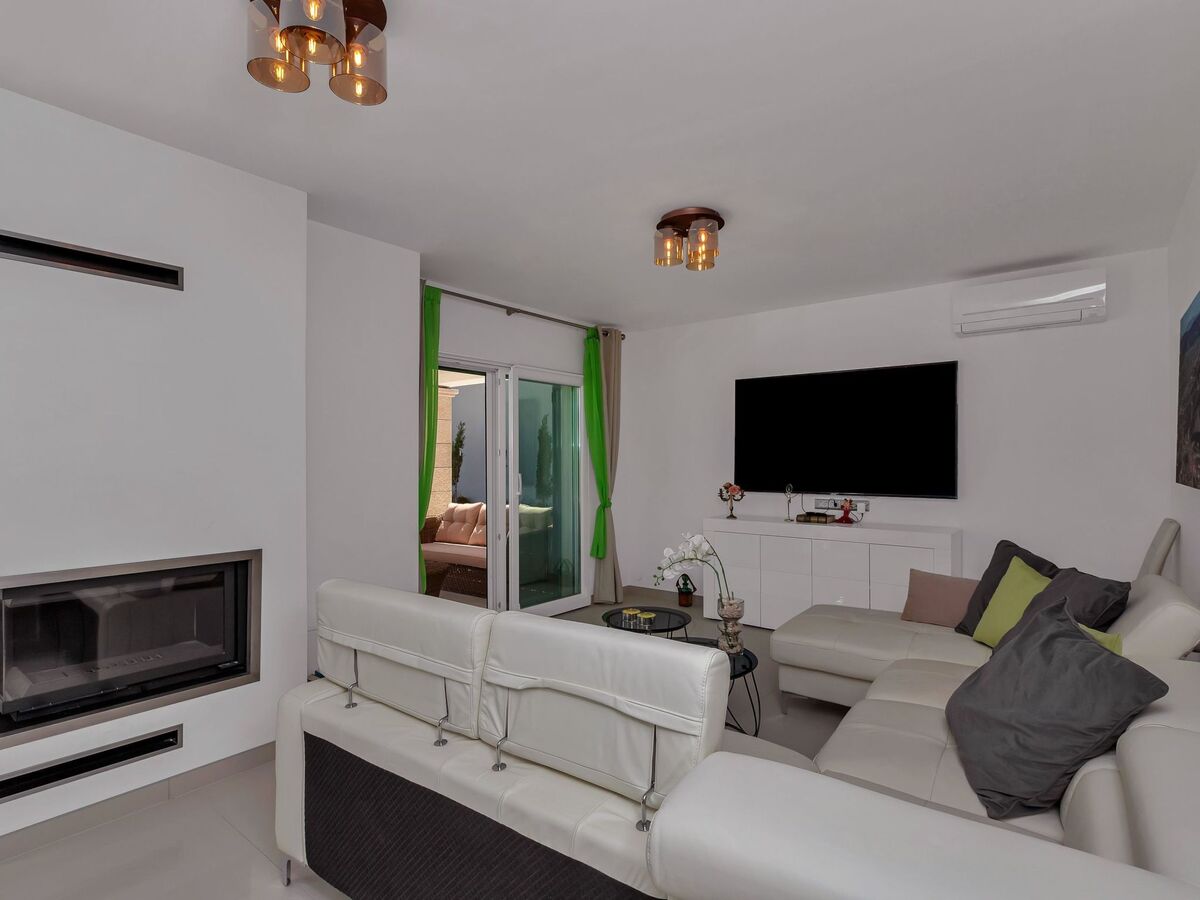 The living and dining area also has a seating area with a sofa bed for 2 people, TV and fireplace.